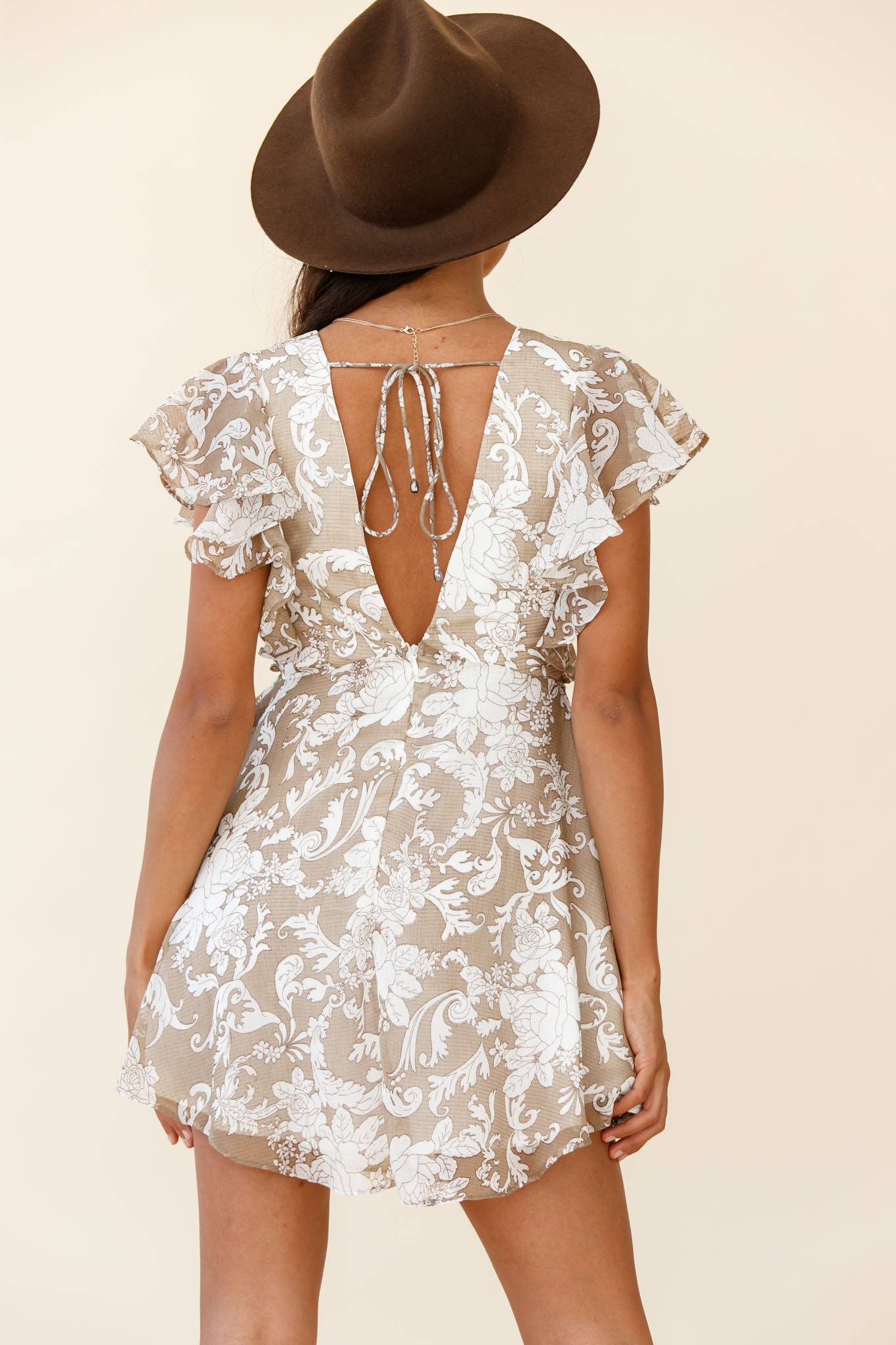 Say That Again Ruffle Shoulder Dress Ornate Floral Print Beige