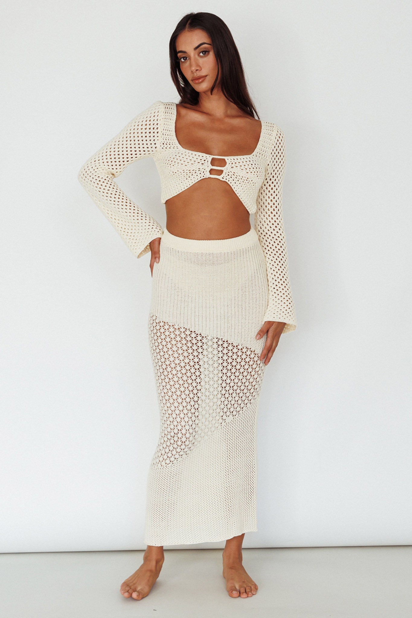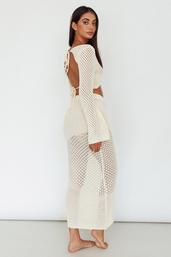 Hello, sunshine! We are in love with our super cute Serenity Sky midi skirt. Featuring a crochet knit throughout and elasticated waistline, it's perfect for sunny days strolling the beach. Team it with its matching top and sandals for a beach babe look.