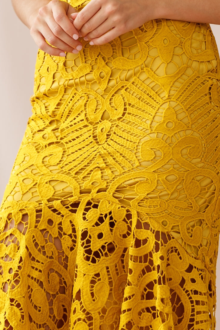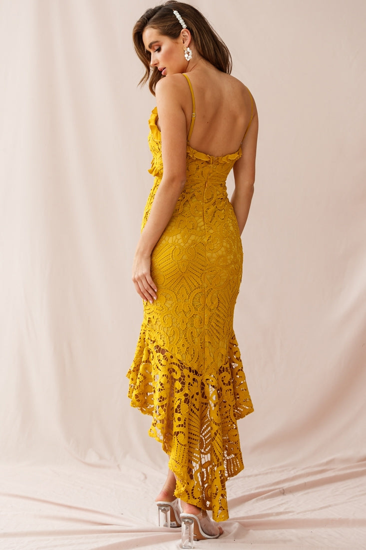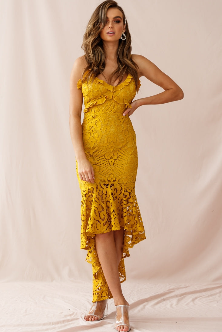 Shakeera High-Low Hem Lace Dress Mustard