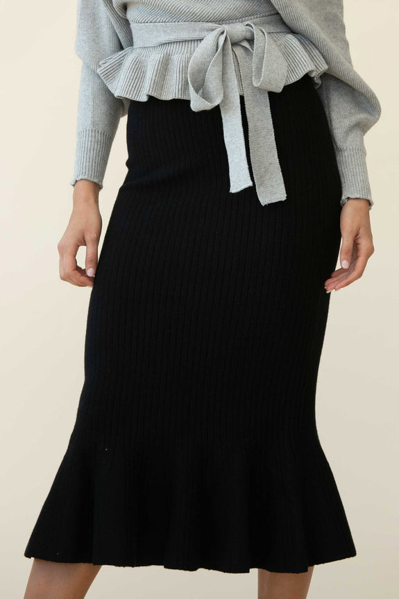 Shalon Ribbed Knit Fluted Hem Midi Skirt Antique Black