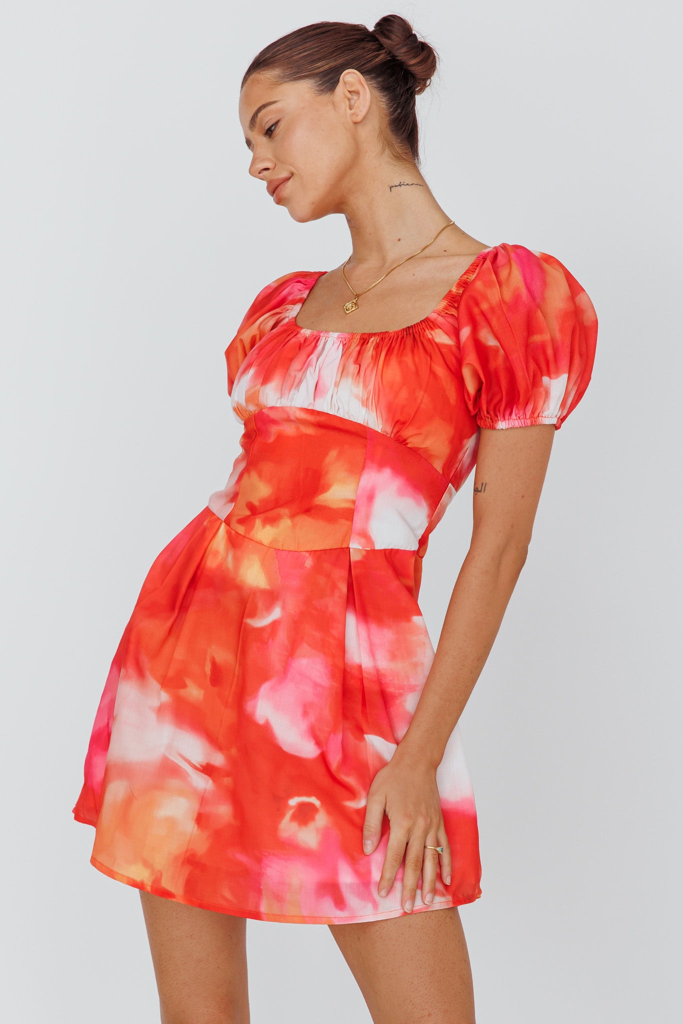 - Red print mini dress