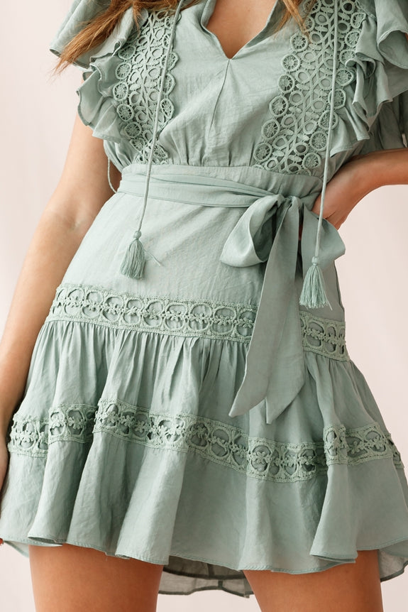 Sheridan Double Frill Sleeve Crochet Detail Dress Olive
