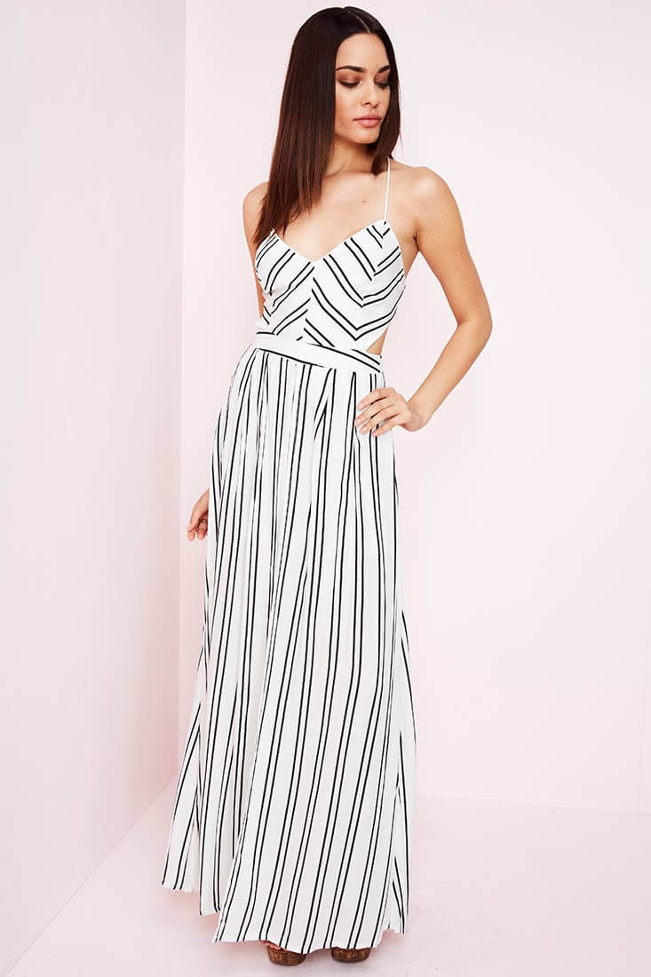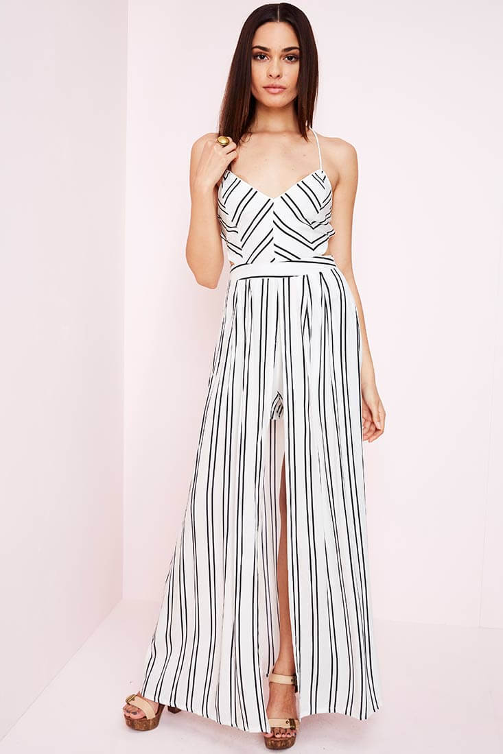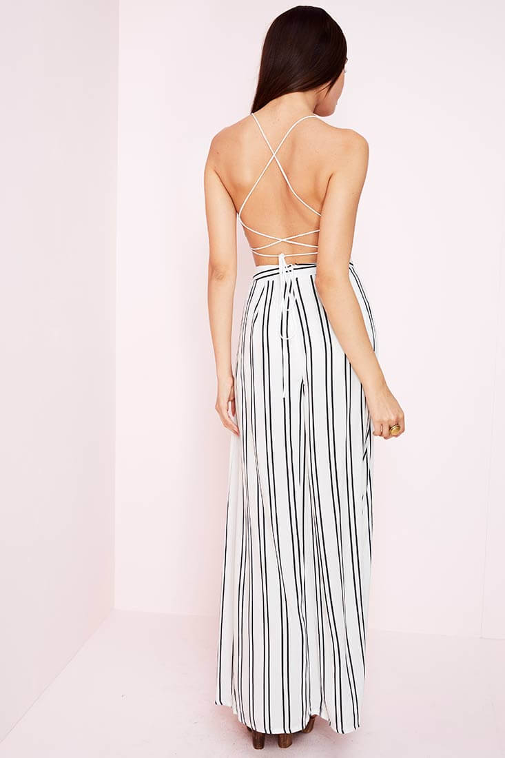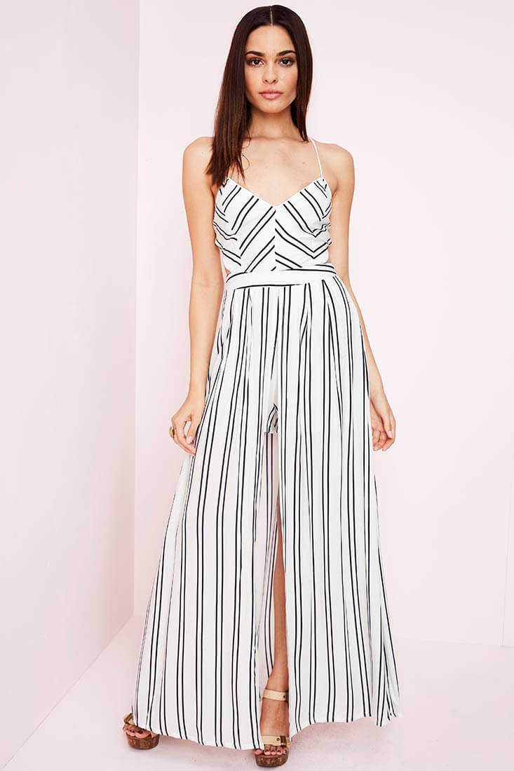 cutout the grey area in this stylish maxi romper. The elegant pin striped pattern convey timelessness while the thigh-high slit and sexy open back bring everything up to date.