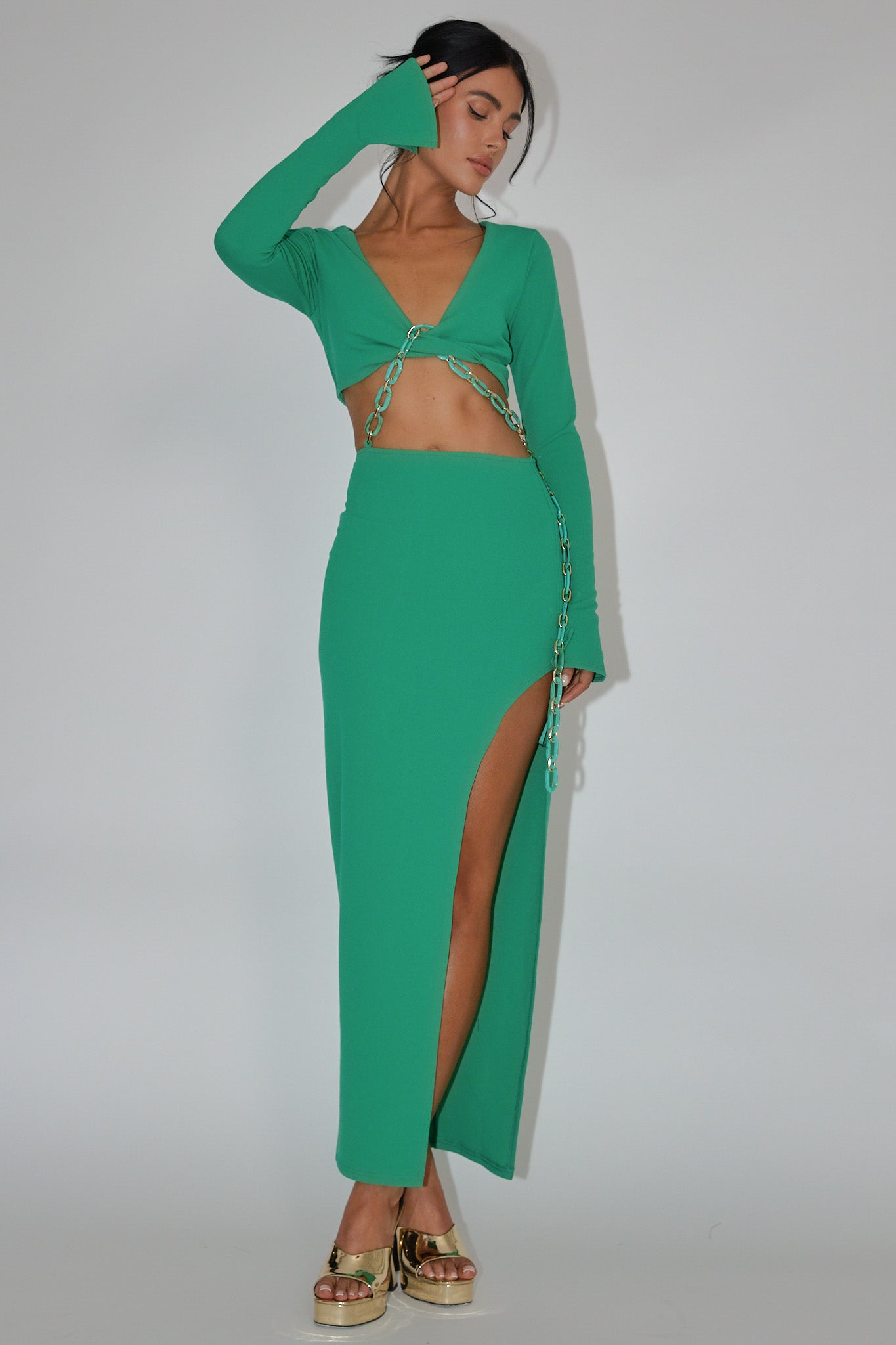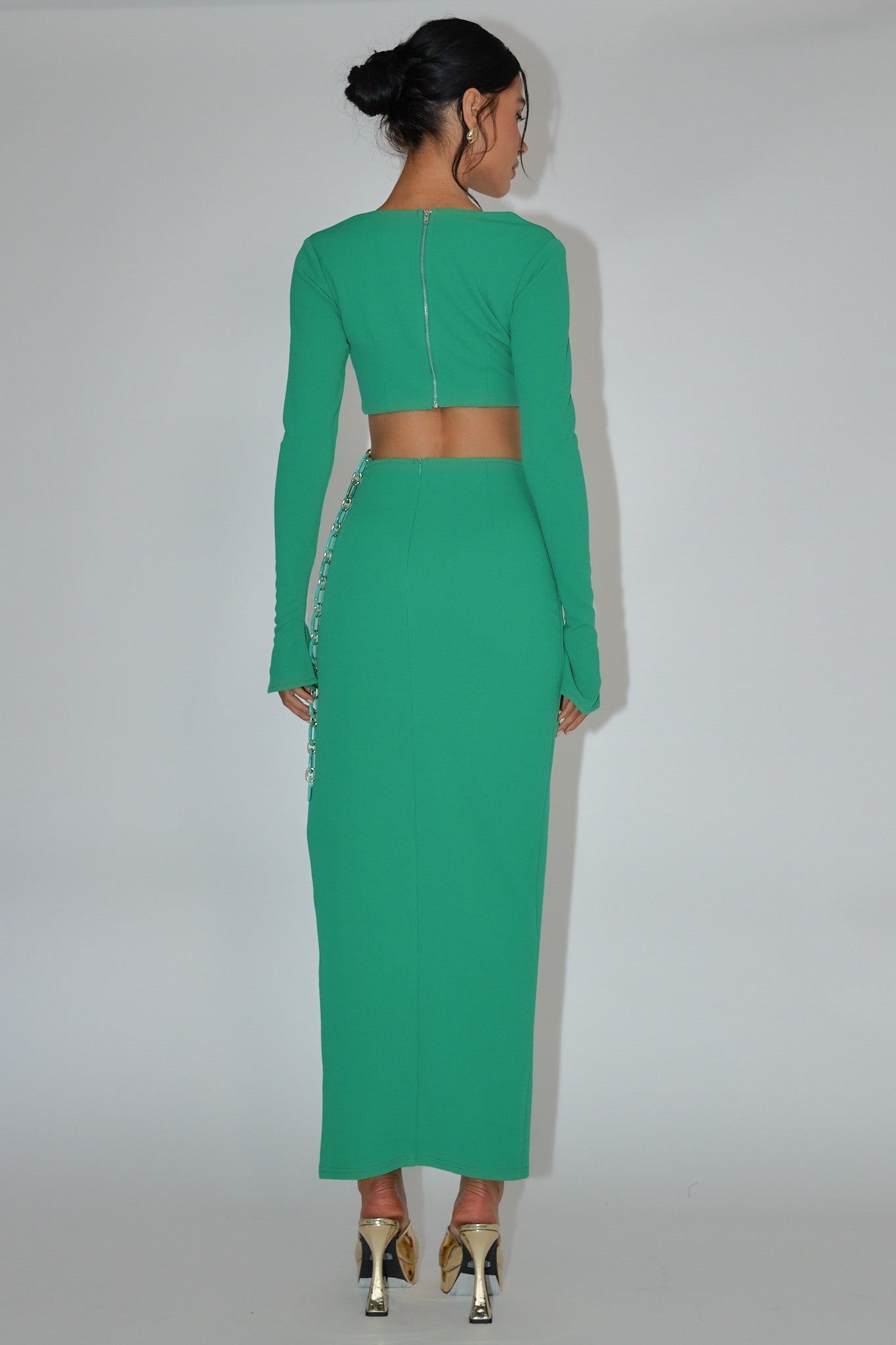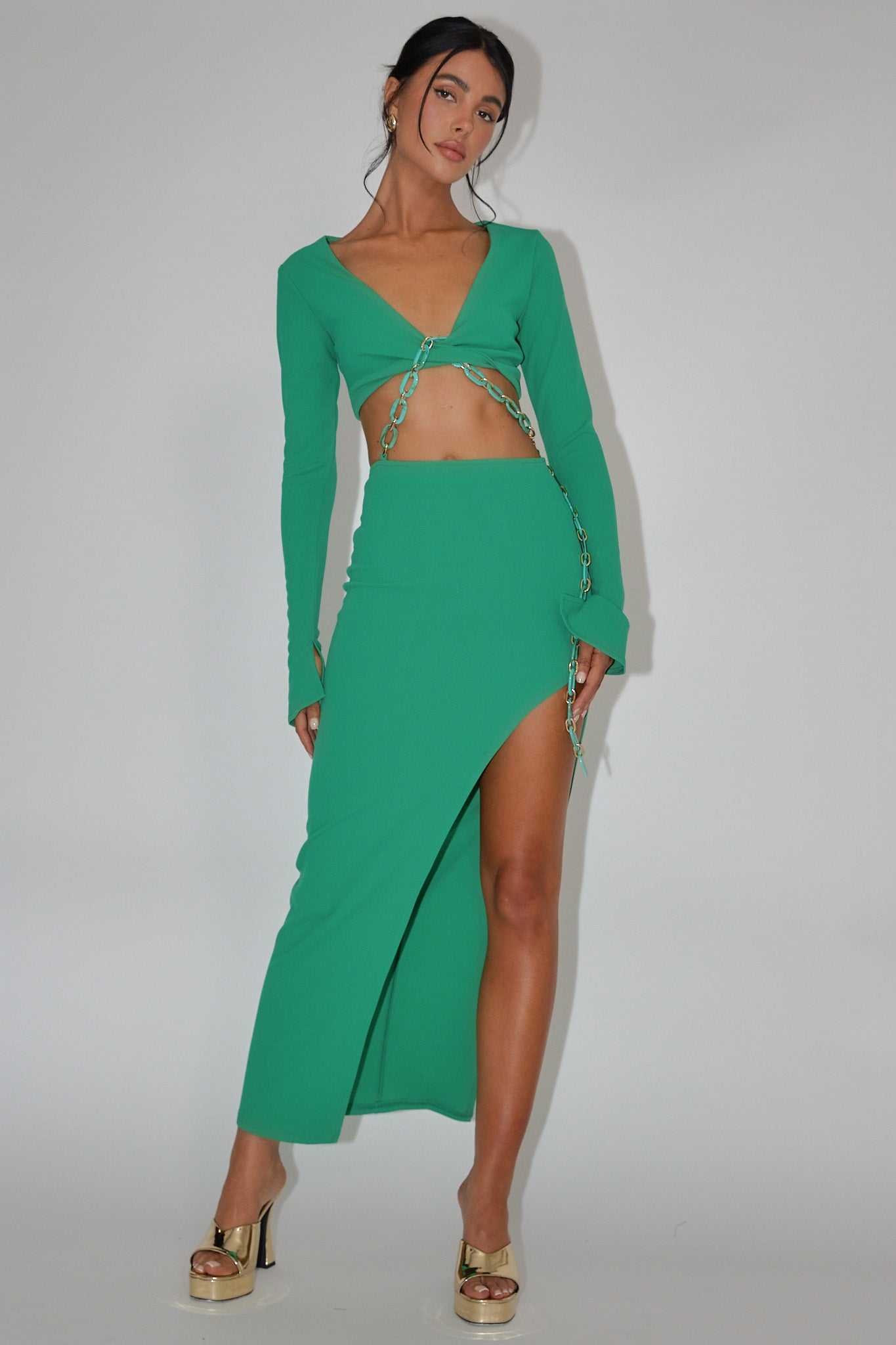 Introducing the stunning Sigournie midi dress. Featuring a super cute acrylic chain feature in the waist. It's perfect for a special birthday celebration teamed with gold heels and a purse for a look that will make jaws drop.