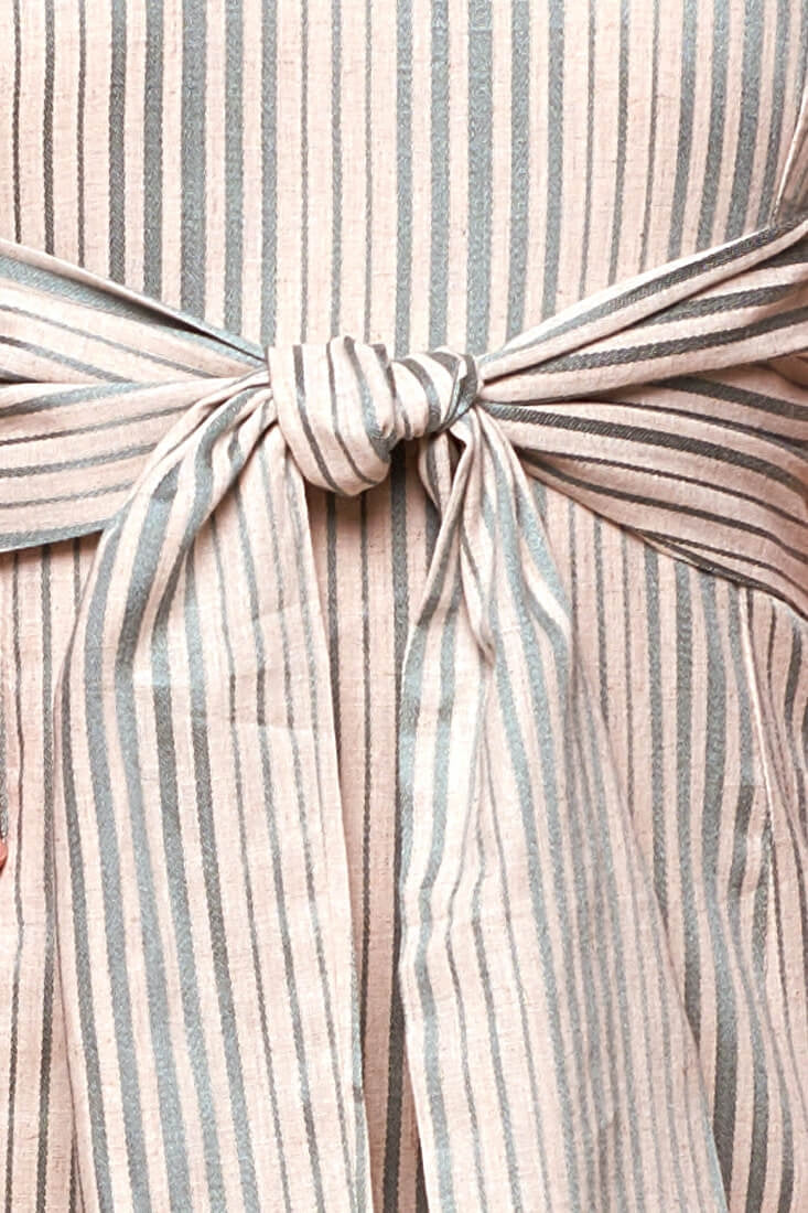 Fitted thin strapped casual striped dress with straight neckline and bow tied at the waist.