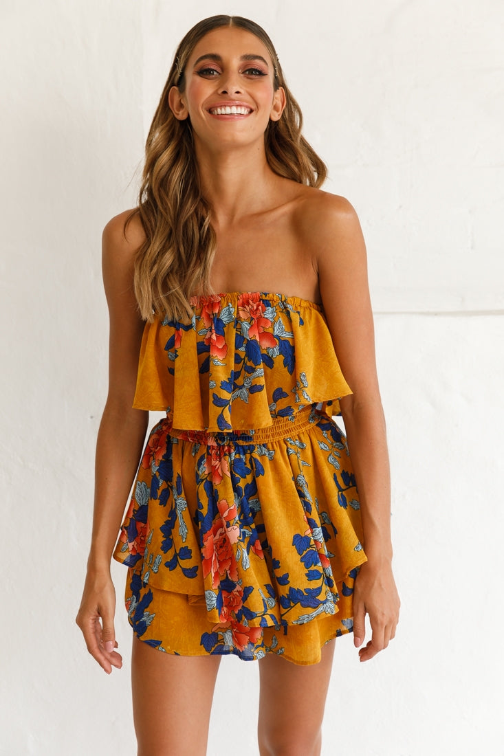 Spice up your life in this fun, ruffled romper. Adorable tube top fit and bold color will make you want to wear this summery piece all of the time. Throw on an oversize cardigan and this piece transforms into a fall staple.