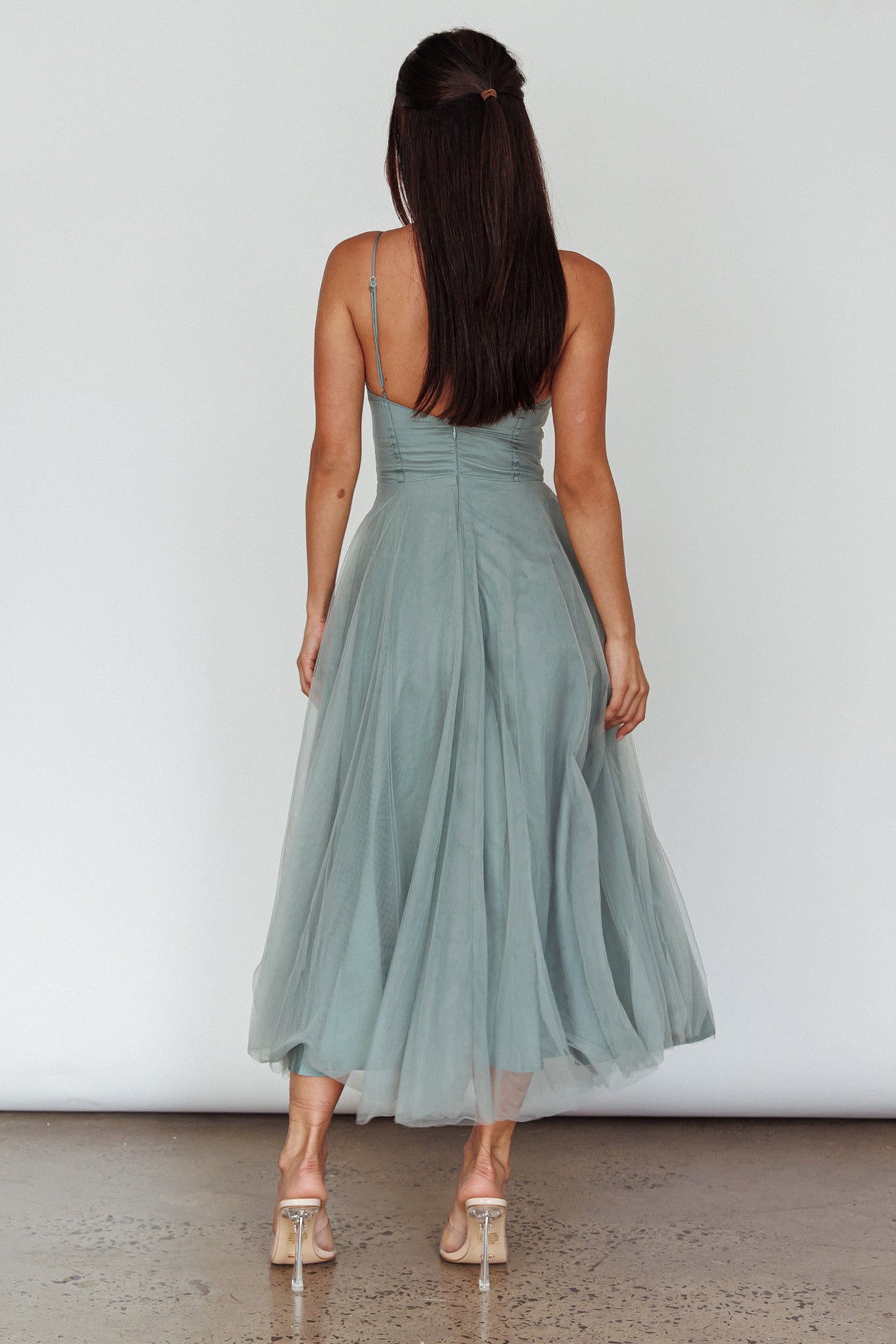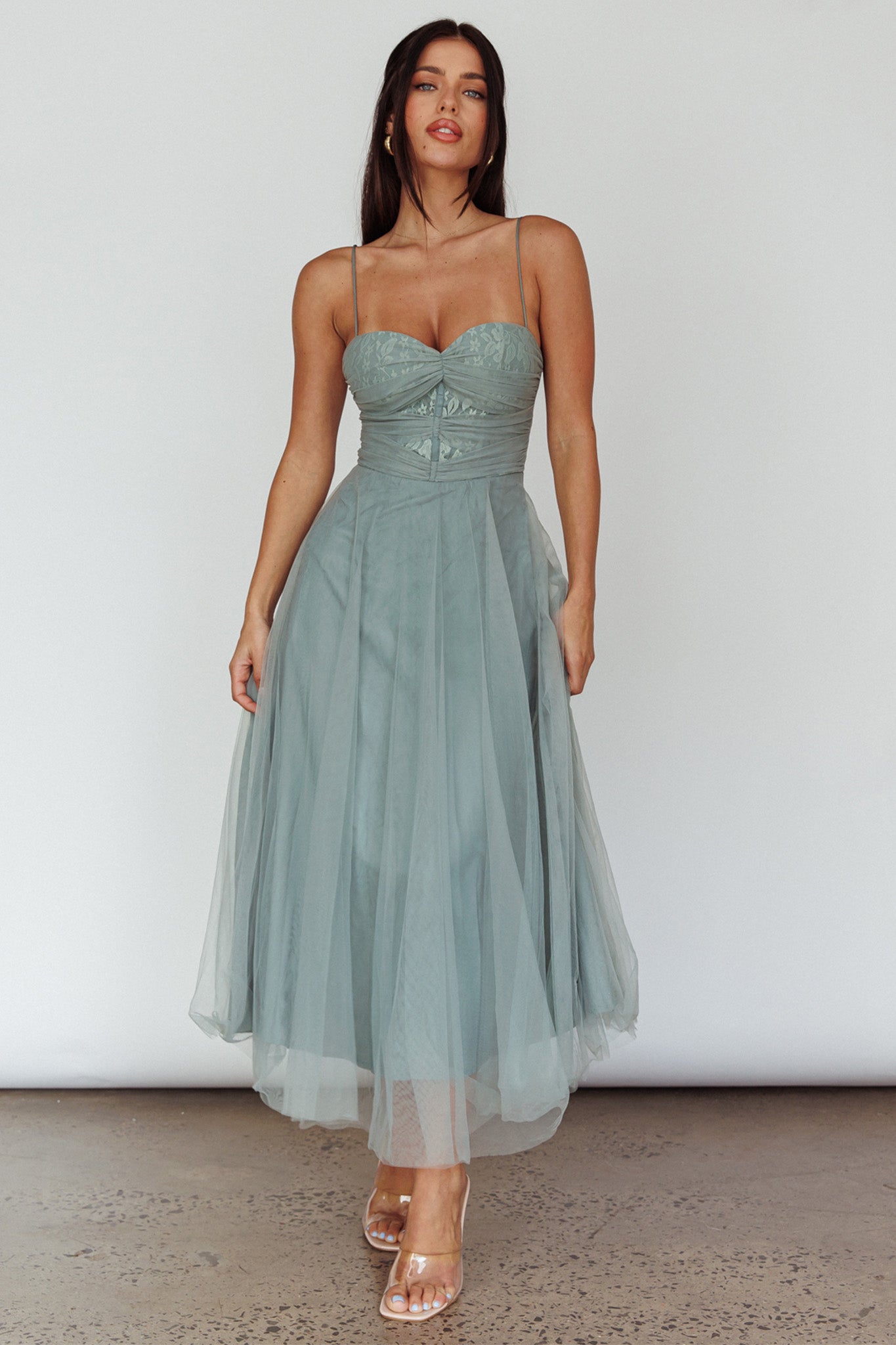 Smitten Lace Insert Tulle Midi Dress Sage