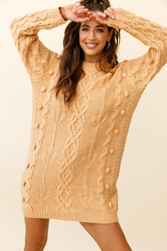 You'll look like the dreamiest snow bunny in our cozy Snowstorm sweater dress. We are loving the chunky cable knit and adorable pom pom details. Perfect for cozying up by the fire teamed with tights and over-the-knee boots.