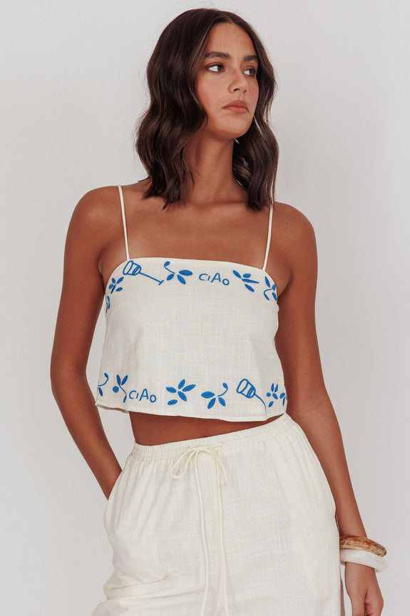 Float through your weekend in our super cute Sorrento Summer top. We are obsessed with its Italian-inspired embroidery detail and breezy crop length. It's perfect for Sunny weekends strolling your fave vintage flea markets with your BFF. Team it with its matching pants and slides for a look we are crushing on.