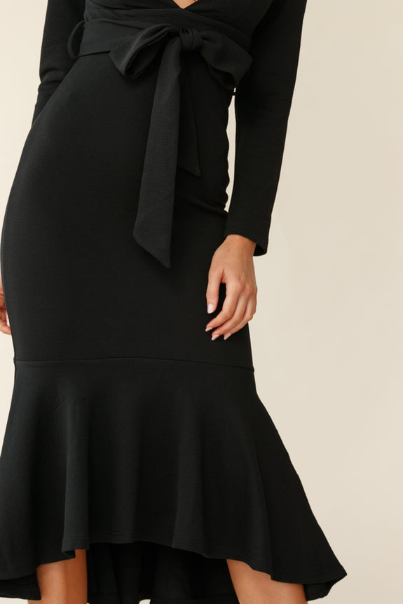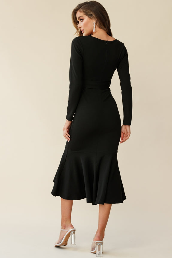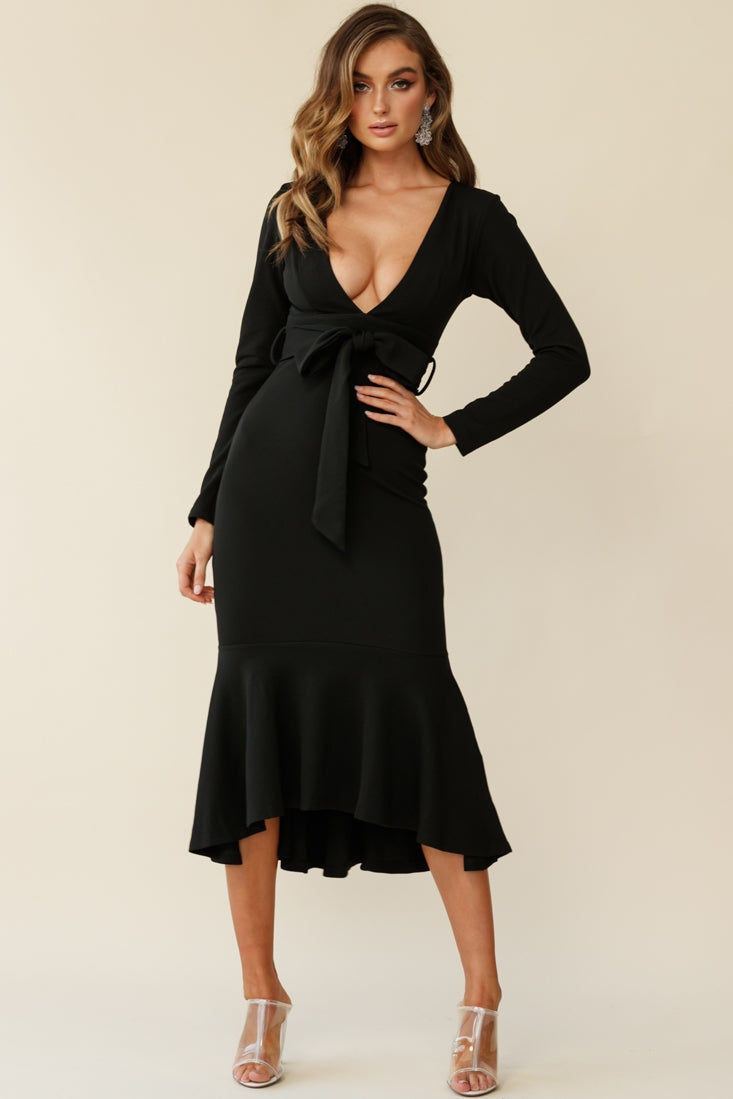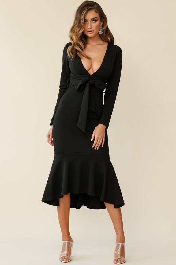 You're going to have to be careful where you wear this number, walk down the street and you could cause an accident! Partially lined, this super hot dress features a deep, V-neckline, belted waist tie, long sleeves, invisible zipper and a stunning flounce hemline. Team it with some clear heels, gold hoop earrings and a clutch and get ready to break hearts. Sorry not sorry!