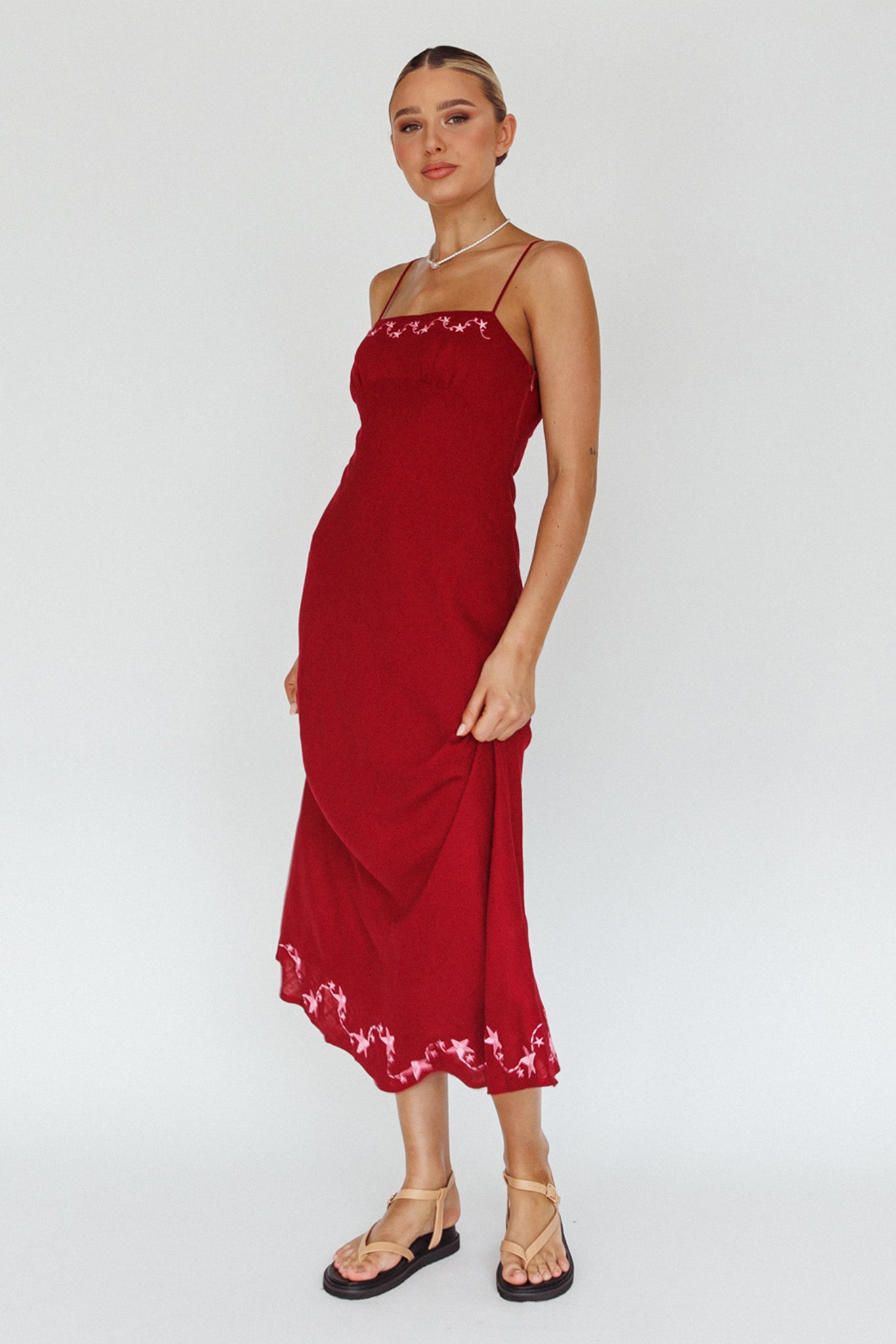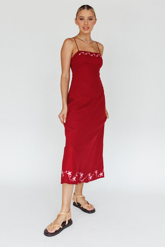 Our Star Garden midi dress is giving us all the 90's vibes and we are here for it. Featuring a classic, square neckline and embroidery detail, it's perfect for a date night with your lover. Team it with strappy. blocl heels and a tote to complete the look.