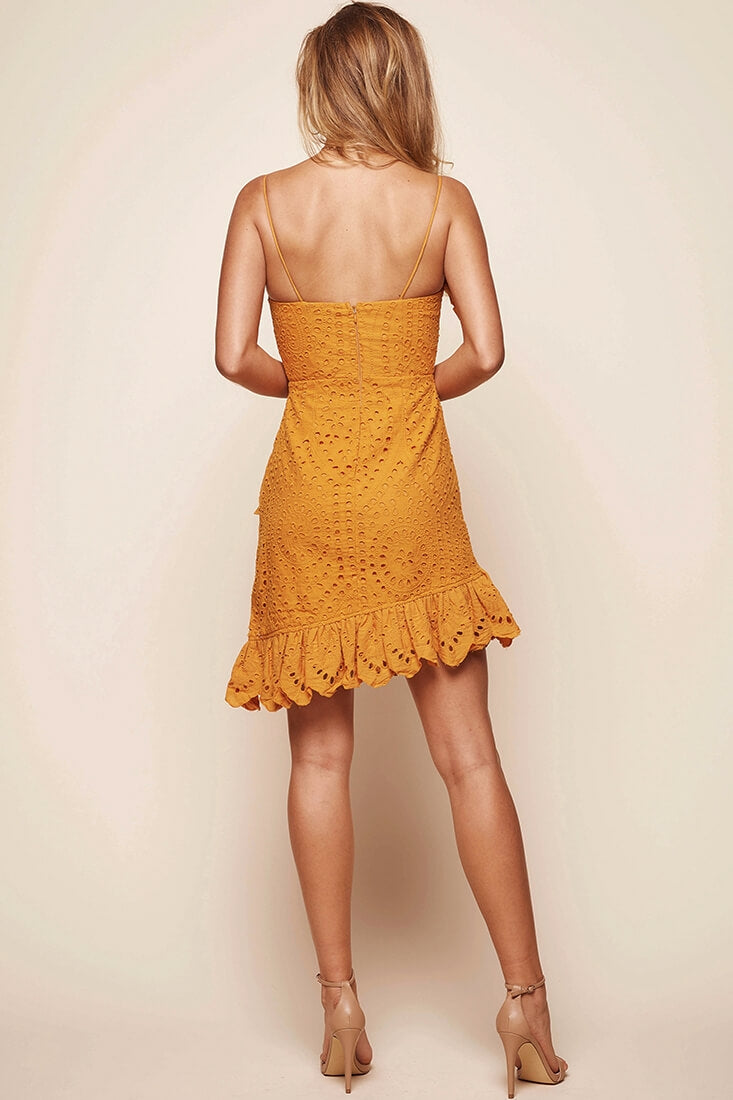 Make a statement in this gorgeous summer dress featuring a sweetheart neckline, spaghetti straps and beautiful broderie anglaise fabric. We love the on-trend ruffle that zigzags up the front of the dress and hems the skirt. Pair it with a straw tote and wedges for a summer-chic look that we're totally vibing.