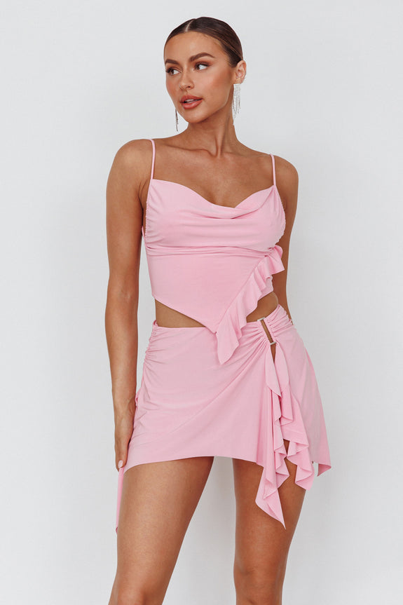 Get ready for heads to turn when you strut by in our hot Such A Tease crop top. Featuring a cowl neck and frill trim. Perfect for a girls' night out on the town. Team it with its matching mini skirt for a hot look we are loving.