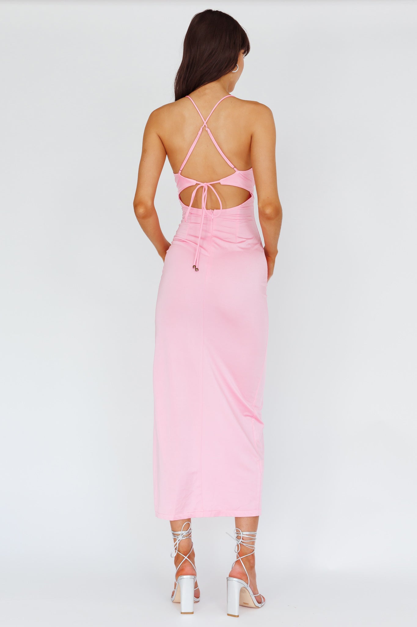 Make them stop and stare in our super cute Summer Rose midi dress. Featuring a hot thigh split in the front and tied back. It's perfect for a fun girls' night out teamed with perspex mules and a baguette bag for a look we are loving.