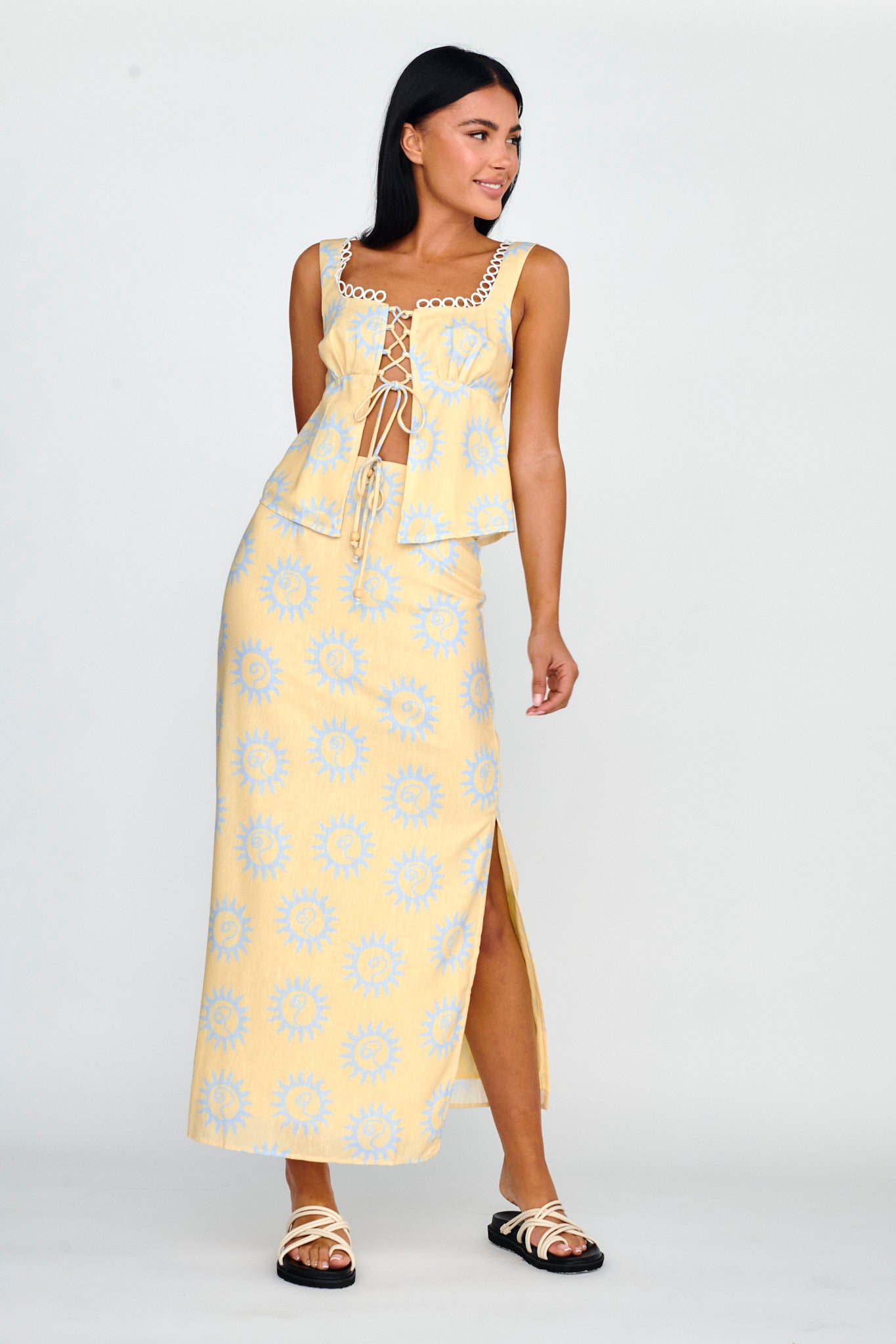 The weekend is calling and you need this skirt! Our Sun Days skirt is perfect for coffee dates with your girls or strolling the vintage markets. We are in love with the cheery sun print! Team them with its matching top and sandals for a chic look we are all about.