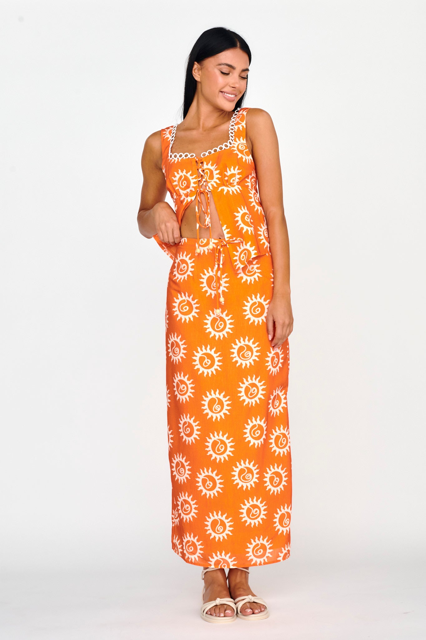 The weekend is calling and you need this skirt! Our Sun Days skirt is perfect for coffee dates with your girls or strolling the vintage markets. We are in love with the cheery sun print! Team them with its matching top and sandals for a chic look we are all about.