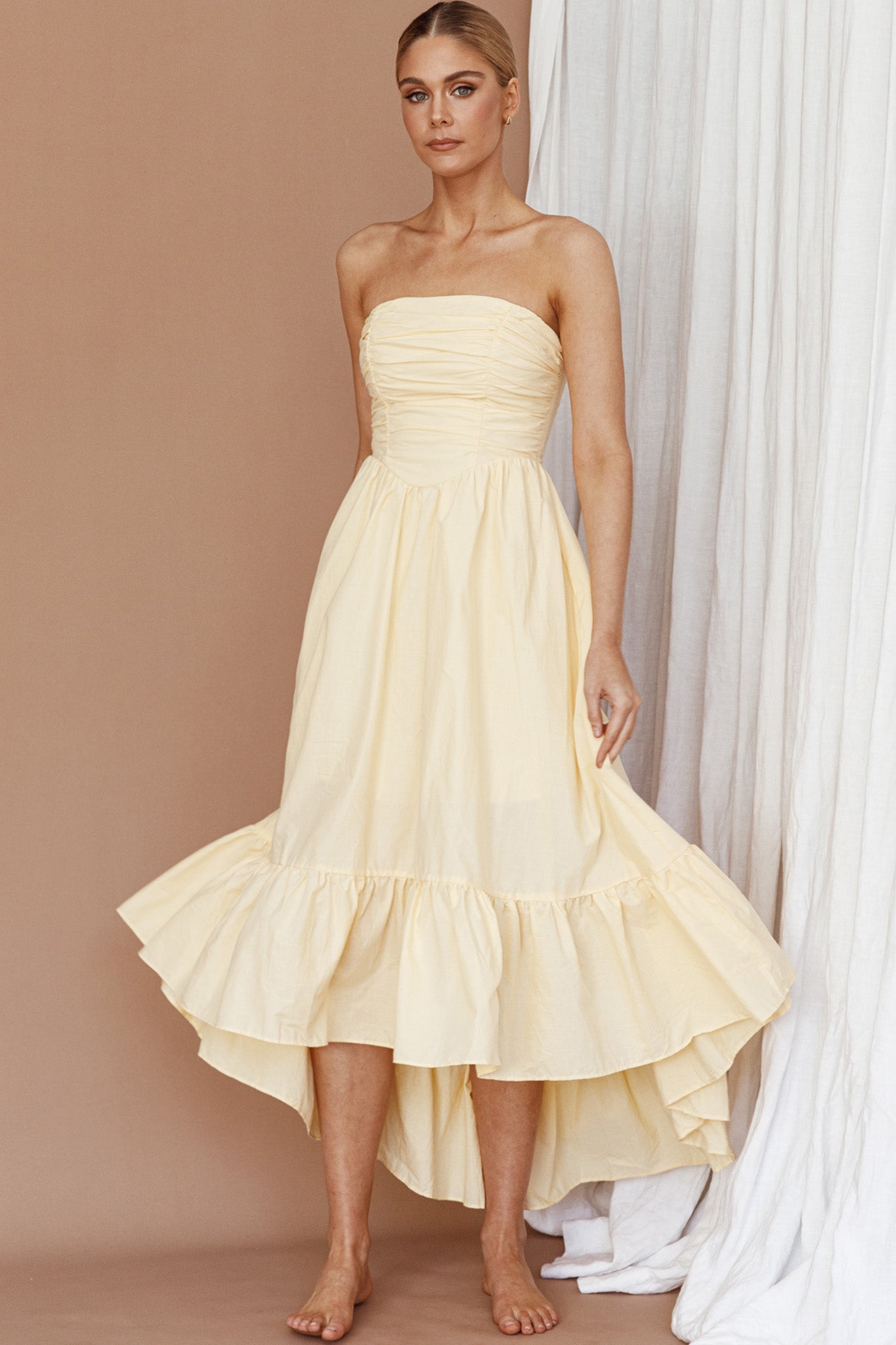 Your wardrobe called, it needs this dress. Our Sunday Mornings dress is perfect for weekend lunch dates or a beach wedding. We are in love with the ruching detail in the bodice and wide, ruffle-trimmed hem. Team it with strappy heels and a tote for a chic look.