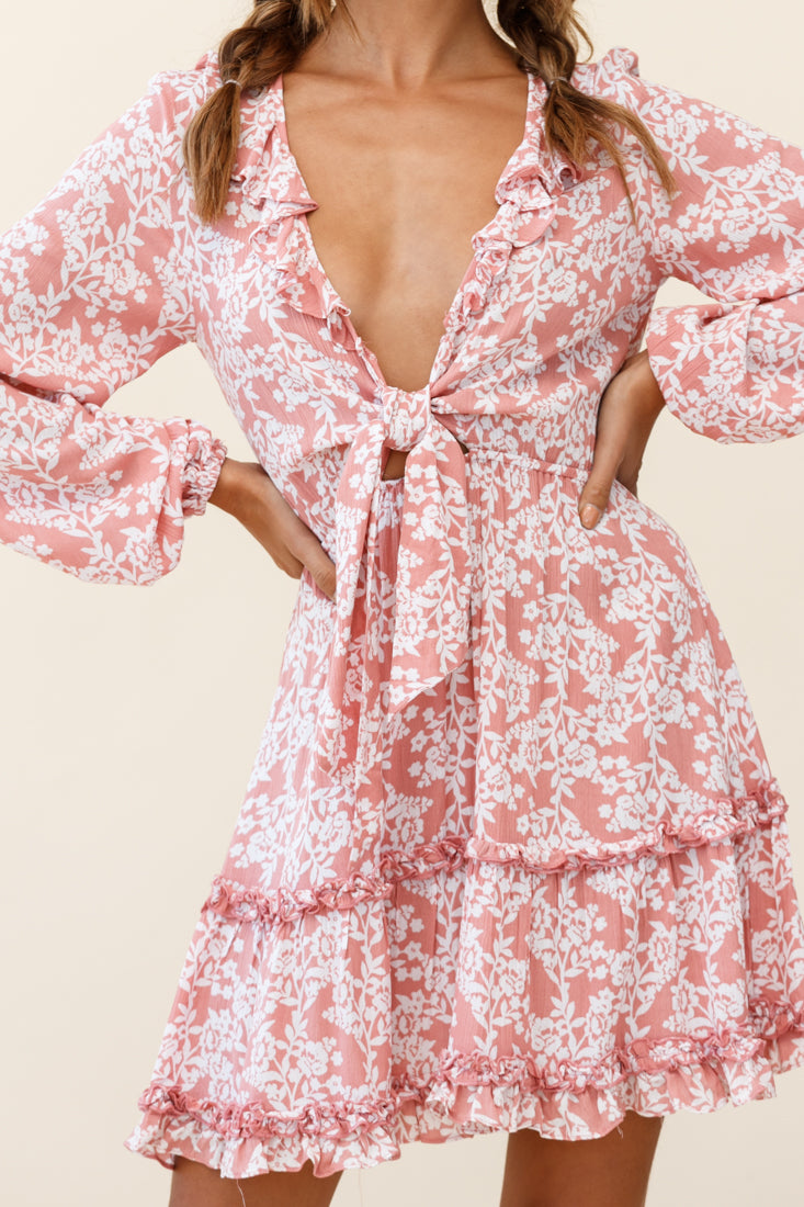 Sunny Daze Long Sleeve Tie-Knot Bust Dress Floral Print Pink