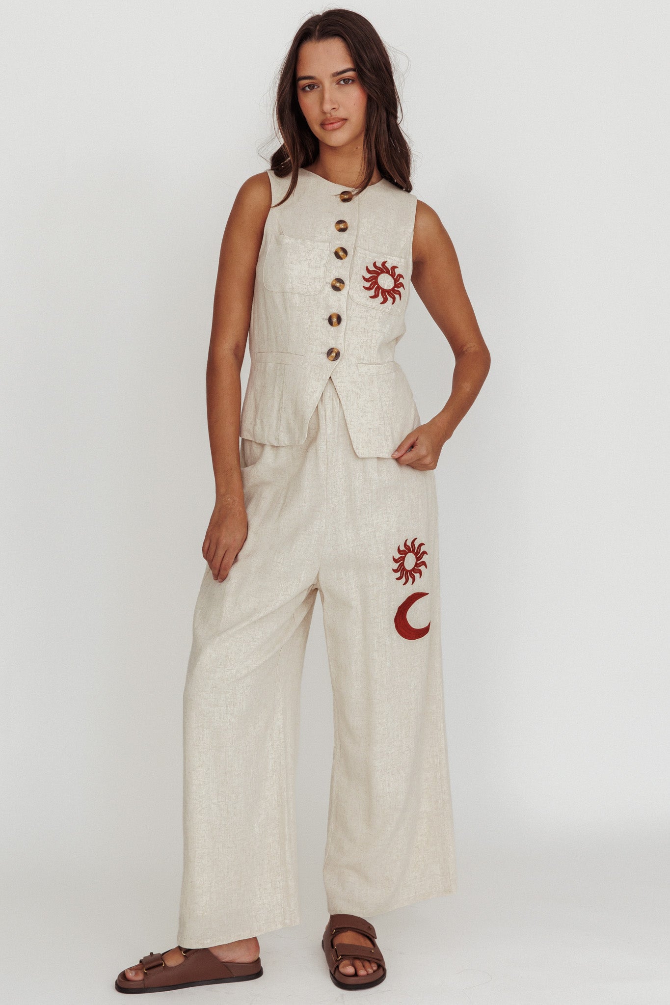 The weekend is calling and you need these casual and comfy pants. Our Swing Of Things pants are perfect for coffee dates with your girls or strolling the vintage markets. We are in love with the sweet sun and moon embroidery detail. Team them with the matching top and your favorite sandals for a casual-chic look we are all about.