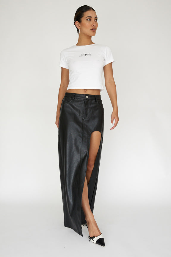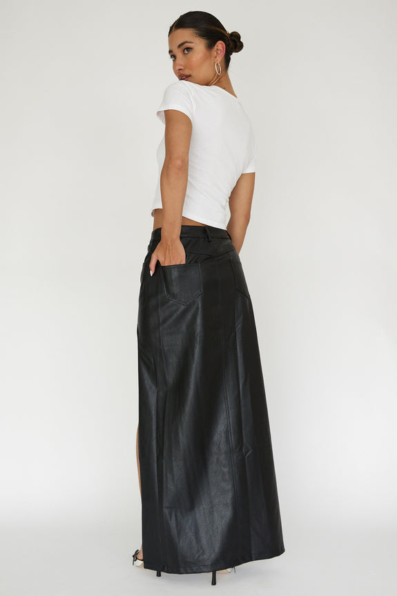 Go straight to the best-dressed list in our super cute Tamille maxi skirt. It features a button and zipper closure and a high split. It's perfect for weekend coffee dates with your girls! Team it with a bodysuit and boots for an on-trend look we are loving.