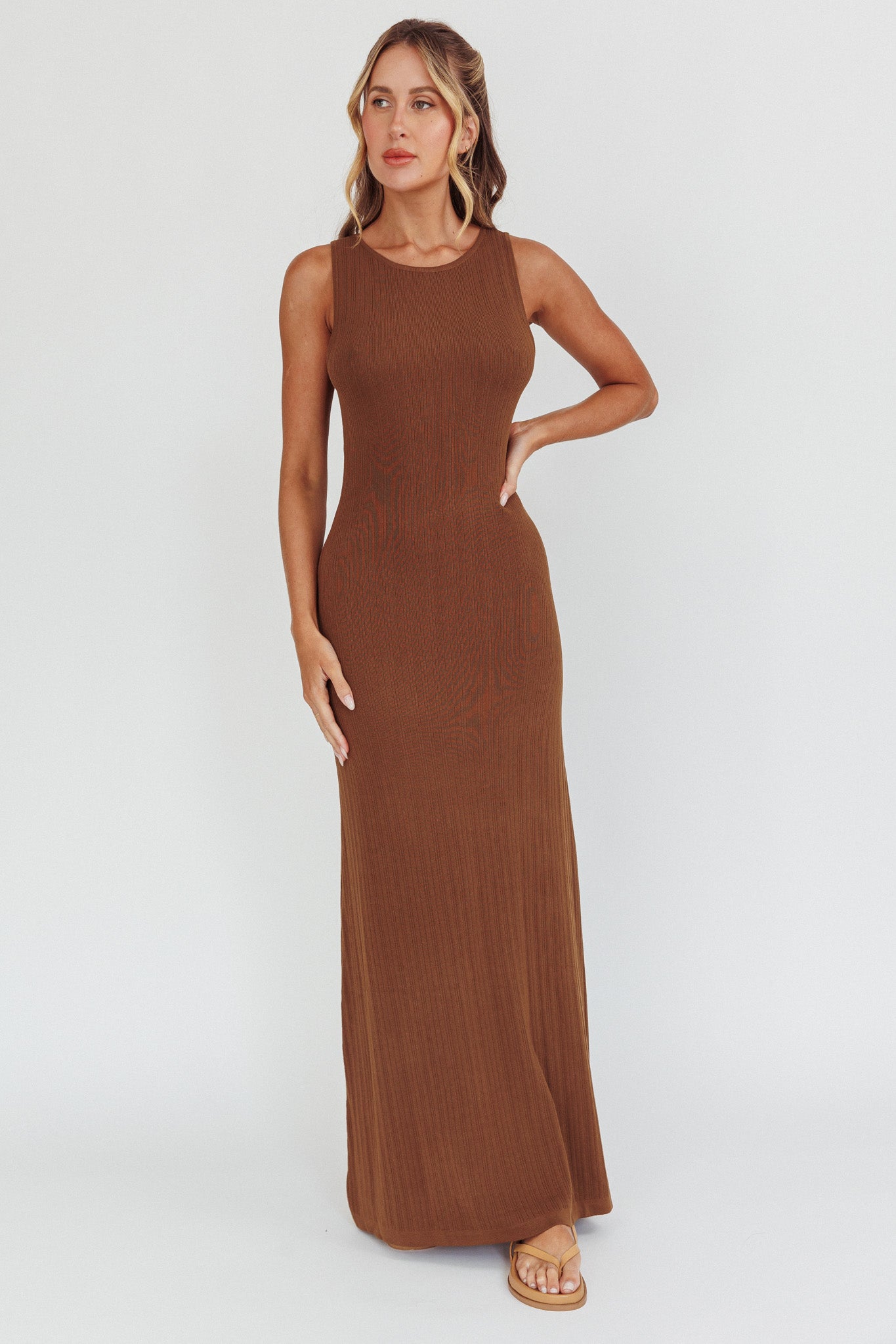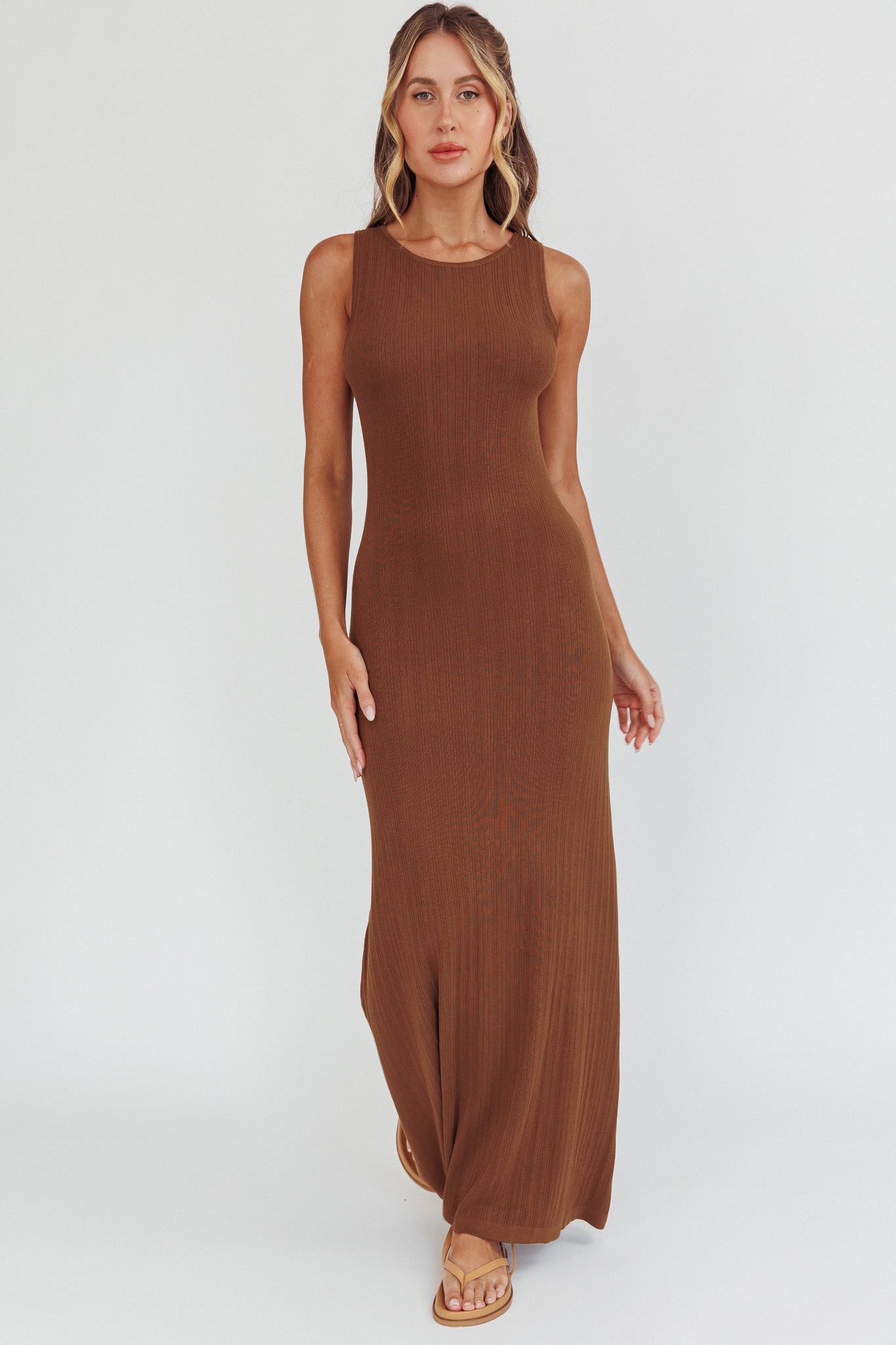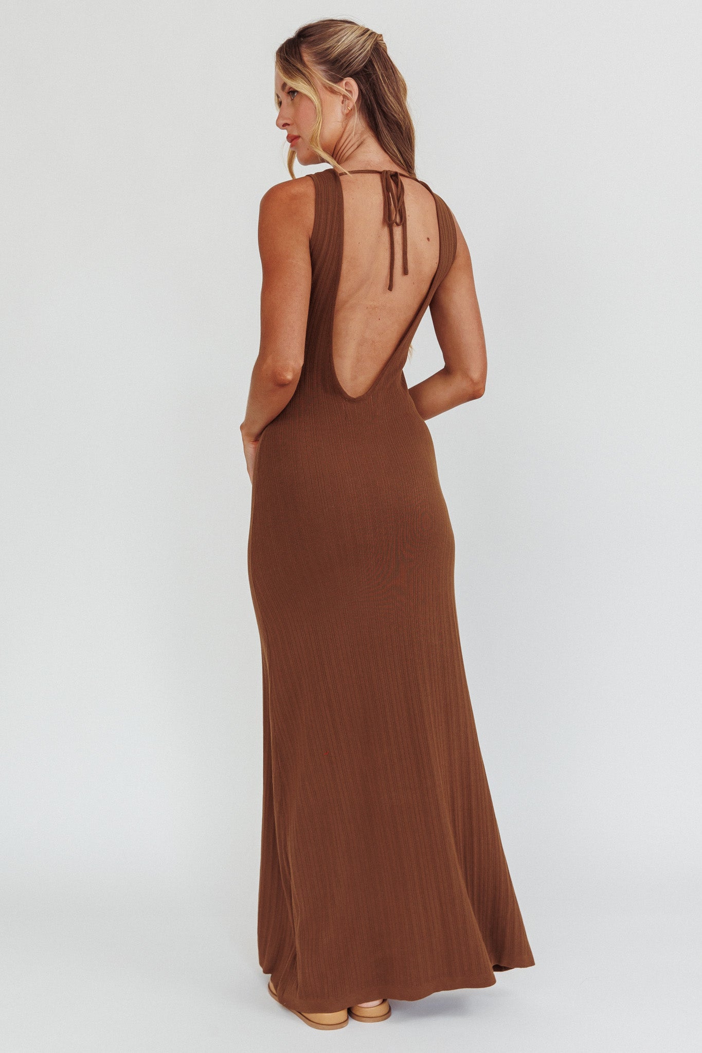 Turn heads in our super chic Tarli maxi dress. It features a sexy, open back and stretchy, ribbed knit fabric. Wear it to Sunday brunch with your girlies teamed with mules and a hobo bag for an effortlessly stylish look.