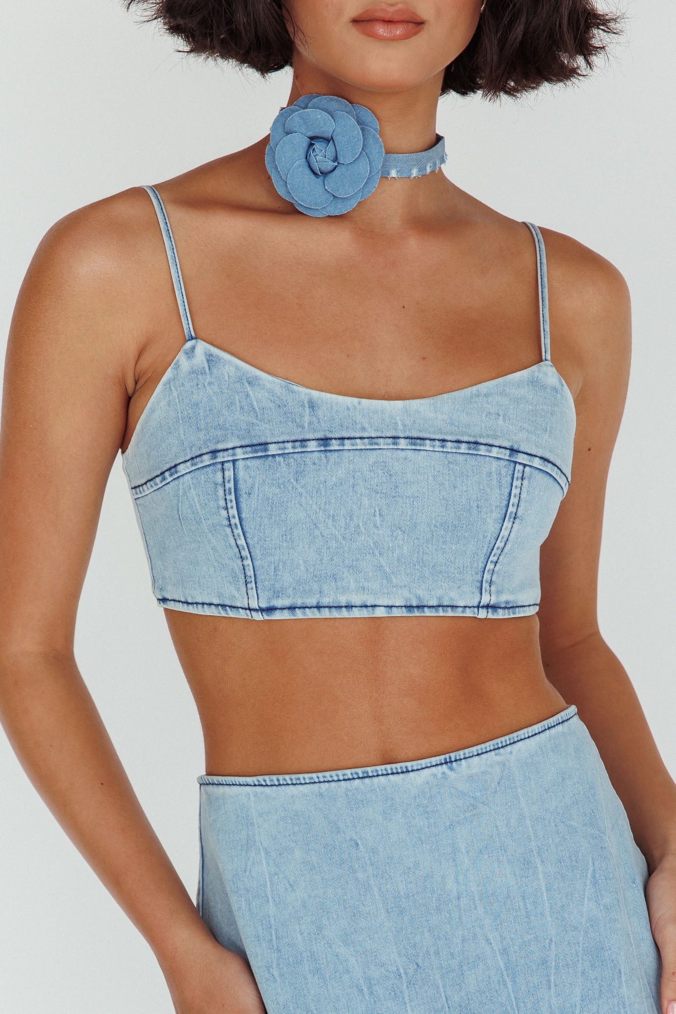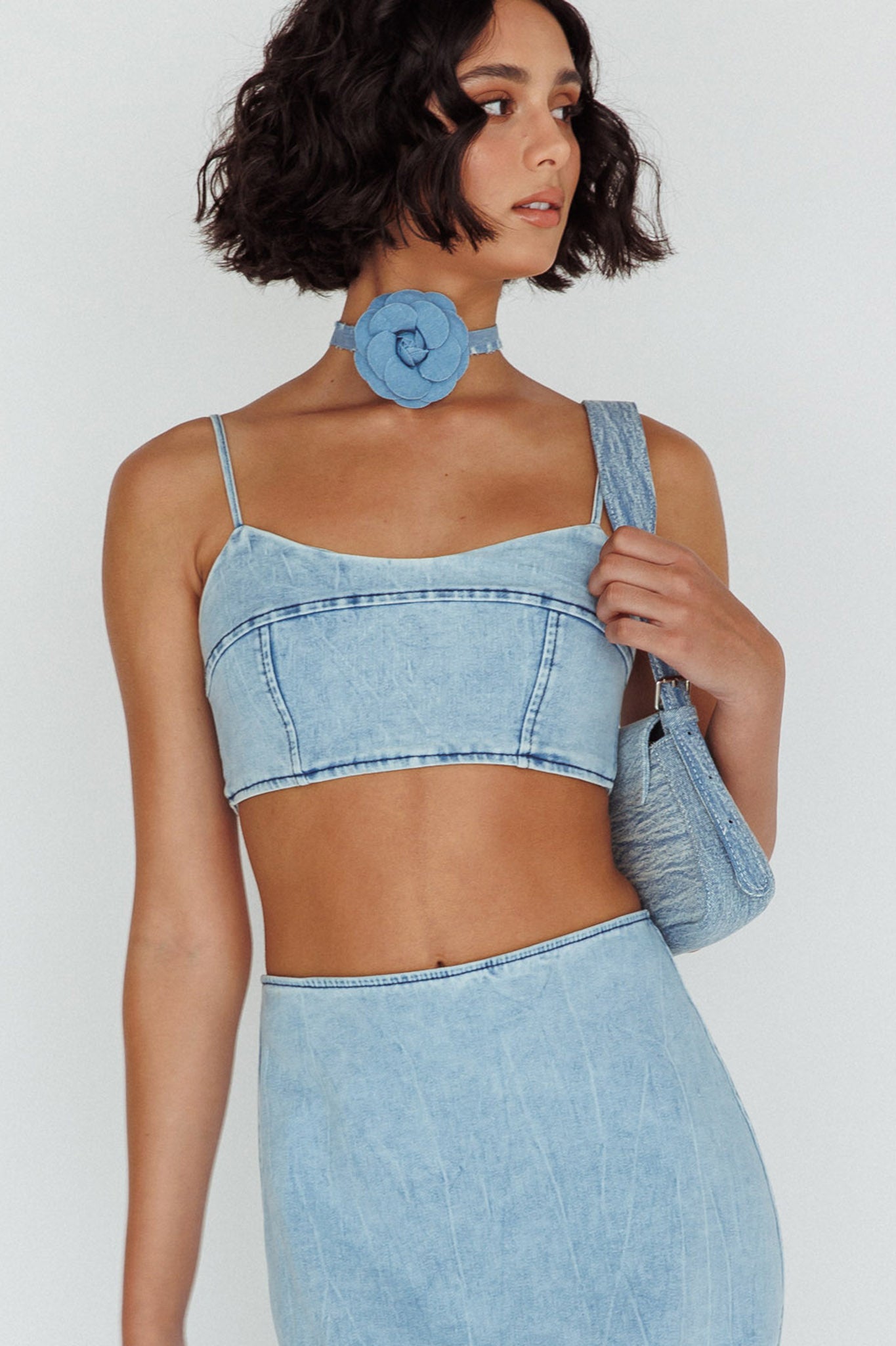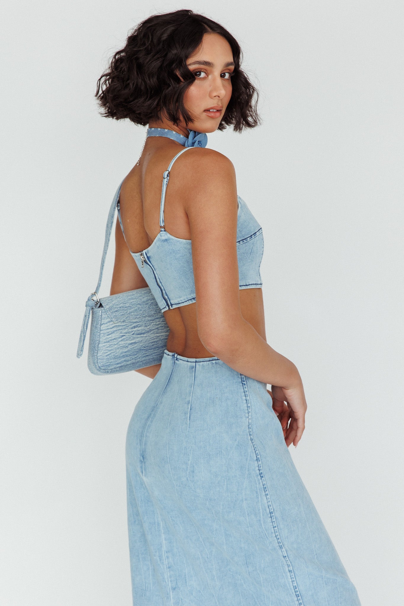 Jaws will drop when you strut by in our The Moment crop top. Featuring an on-trend denim fabric and zipper in the back, it's perfect for a girls' night out or date night. Team it with its matching maxi skirt and clear mules for an unforgettable look.