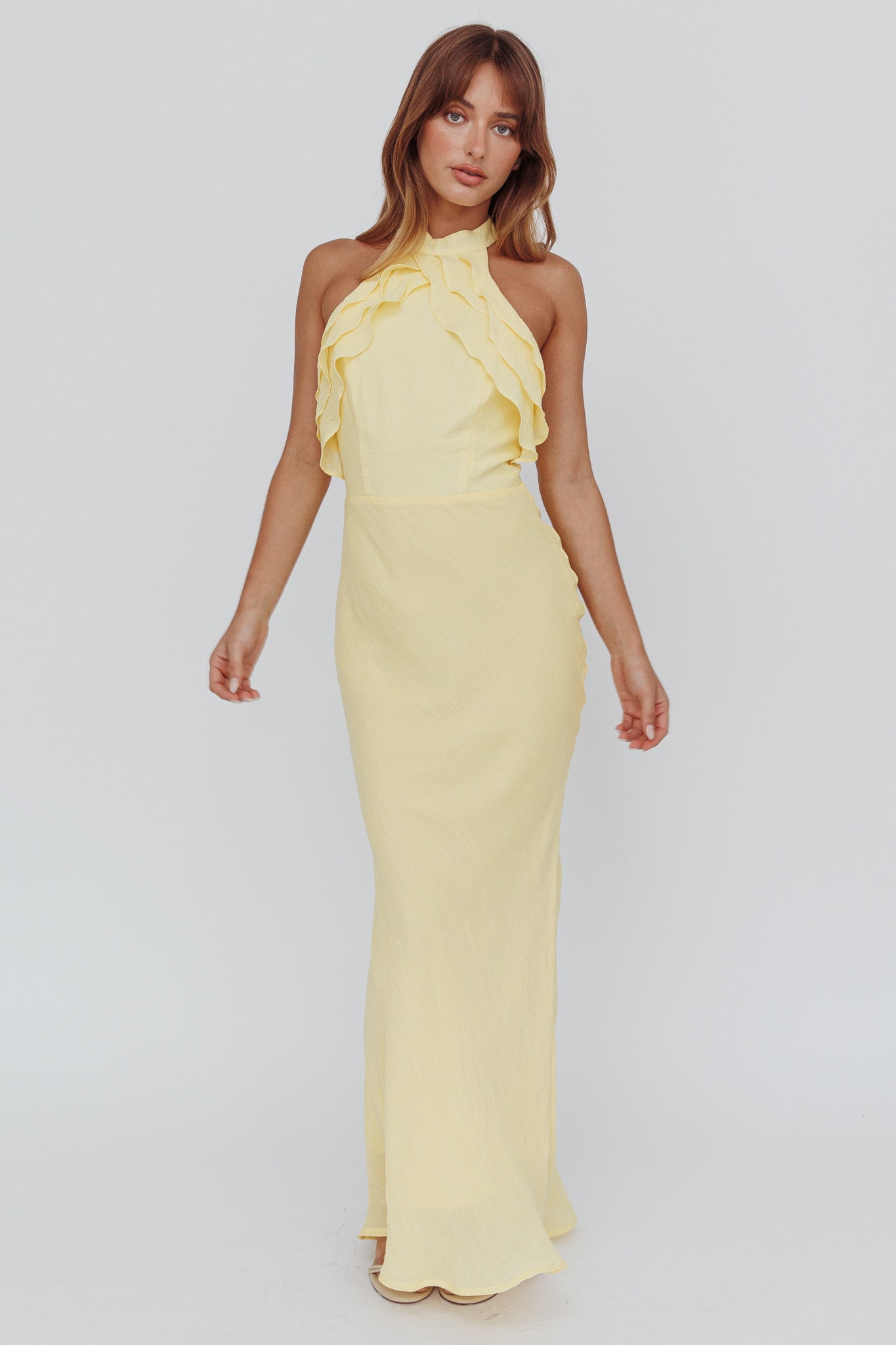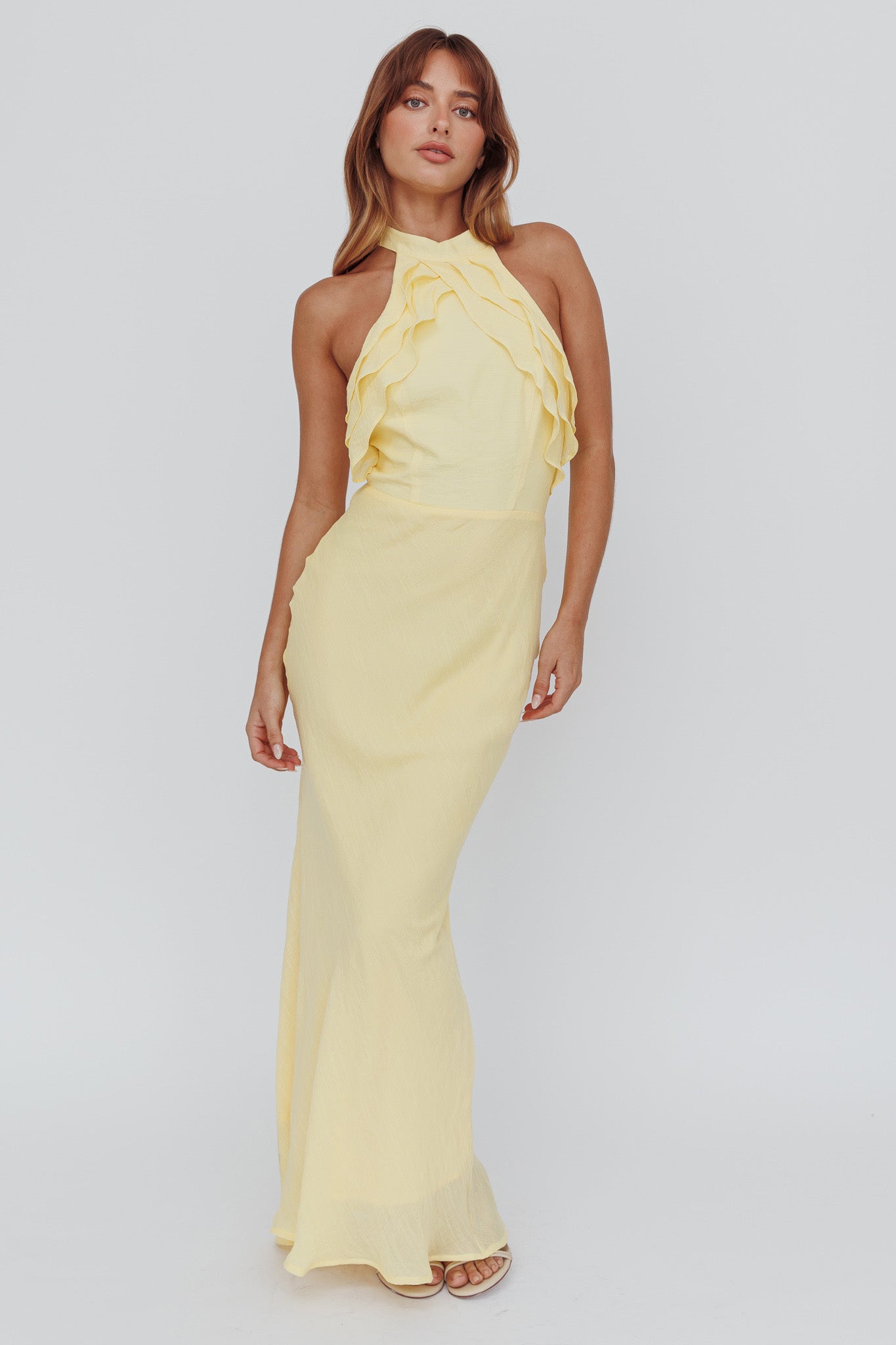 Make them stop and stare in our stunning Topaz Skies maxi dress. Featuring a flattering halter neckline and pretty ruffle trim. It's perfect for a glam event or birthday celebration. Team it with nude heels and a clutch for an unforgettable look.