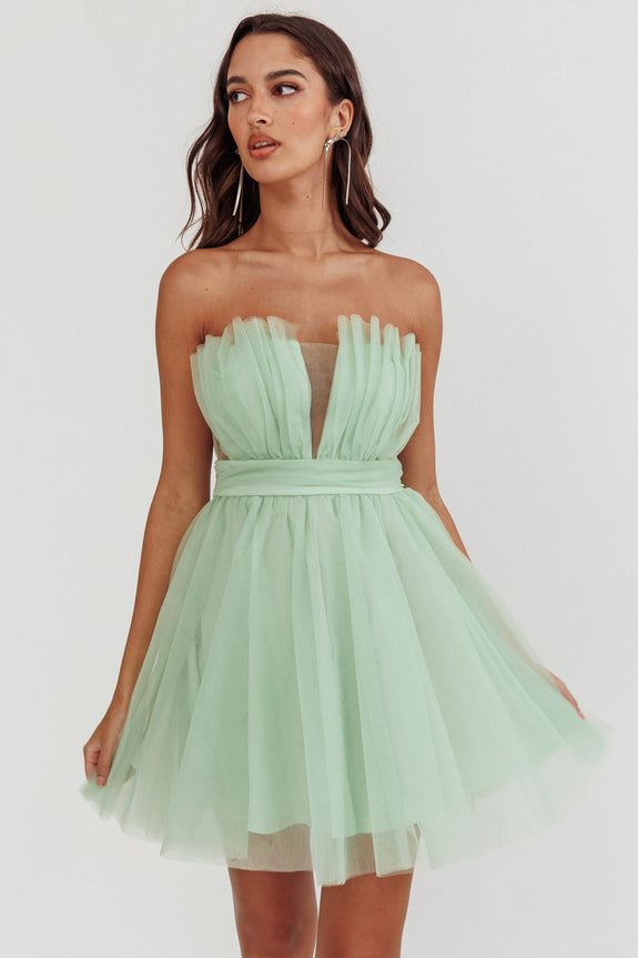 Touch The Stars Gathered Mesh Mini Dress Sage