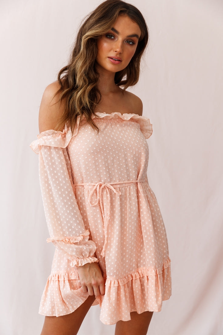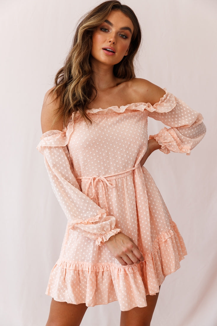 One of our best loved styles now with a Bardot neckline! Featuring soft chiffon fabric covered in frayed-edge polka dots and a dainty string-tie around the waist, this dress is super sweet and feminine. Pair it with nude heels and delicate jewelry.