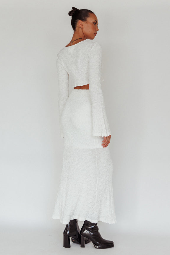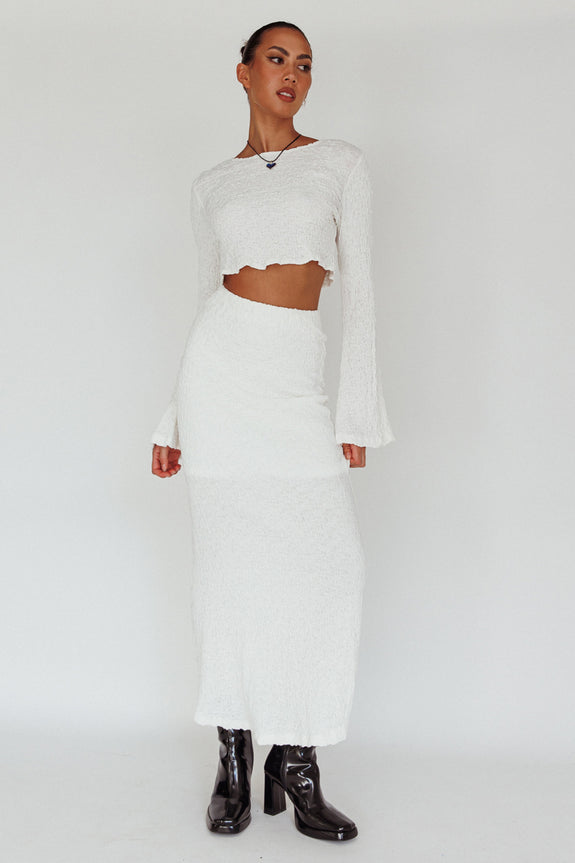 Channel your inner It Girl in our chic Treasures midi skirt. Featuring a textured fabric and elasticated waist. Perfect for a dinner date with your girls! Team it with its matching crop top, mules and a tote for a look that will turn heads.