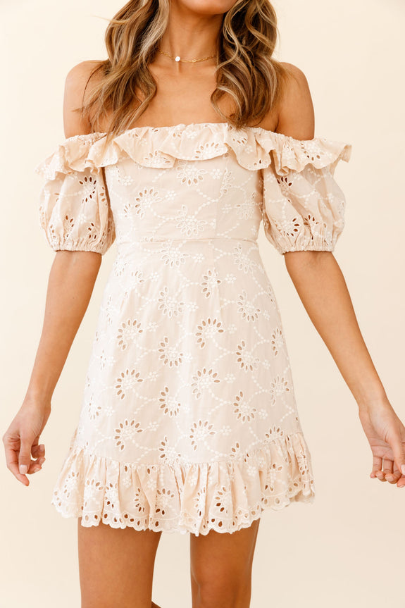 Make an entrance in our pretty Up Front dress. It's giving us all the girly vibes with that eyelet embroidery detail and frill-trimmed, off-shoulder neckline. Wear it to lunch dates with your besties or to work for ultimate style-queen status. Team it with strappy block heels for an on-trend look.