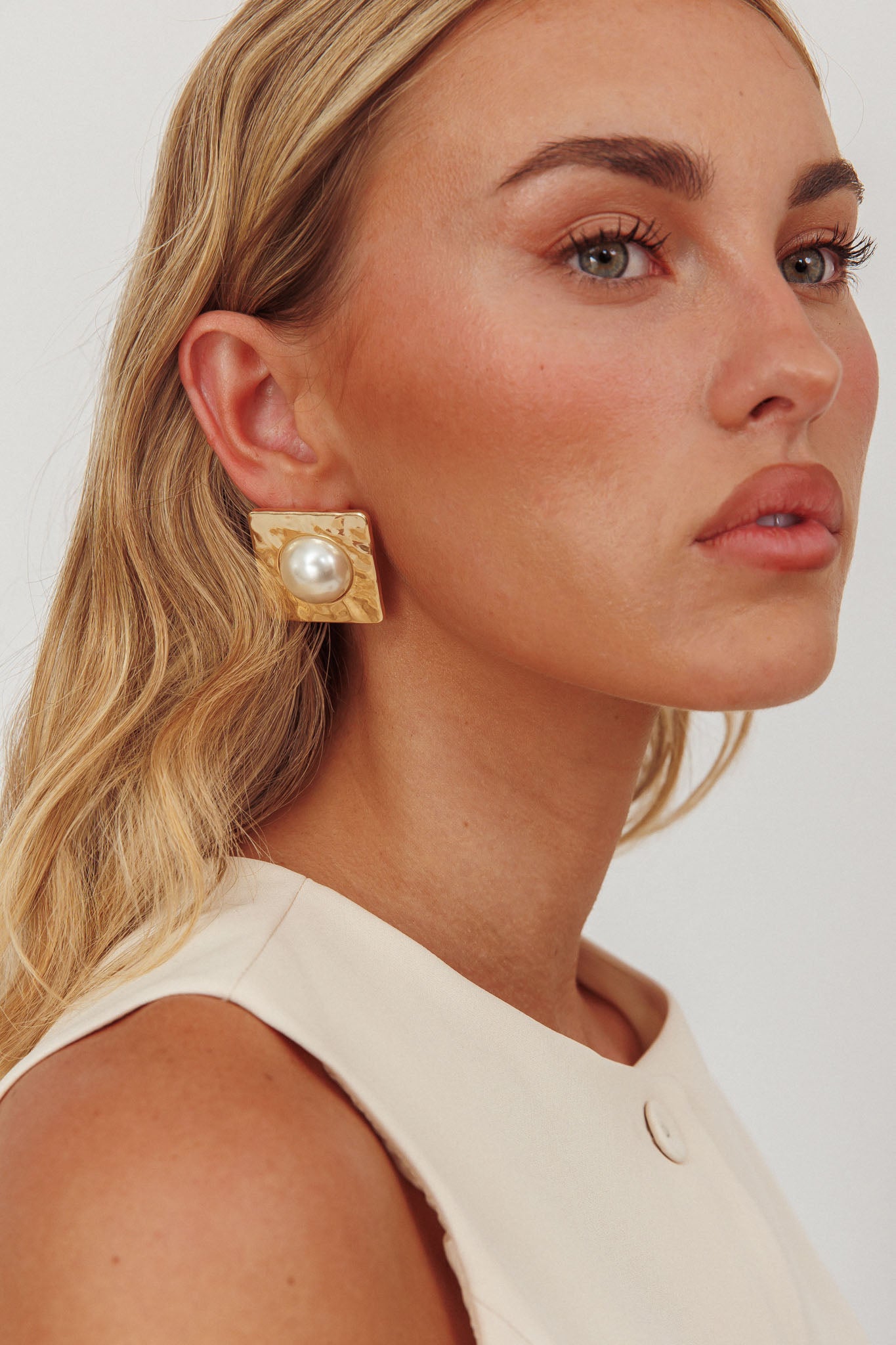 Elevate your look with our stunning Vanessa earrings. They feature a pretty pearl accent and hammered gold finish and are perfect for a date night or a glam event. Team them with our Well Versed dress for a look that will make jaws drop.