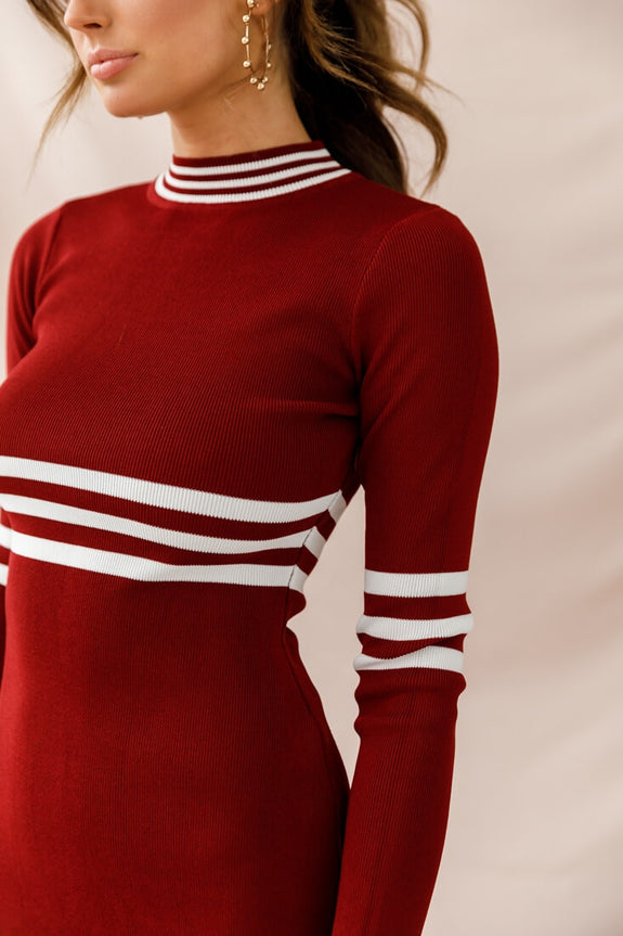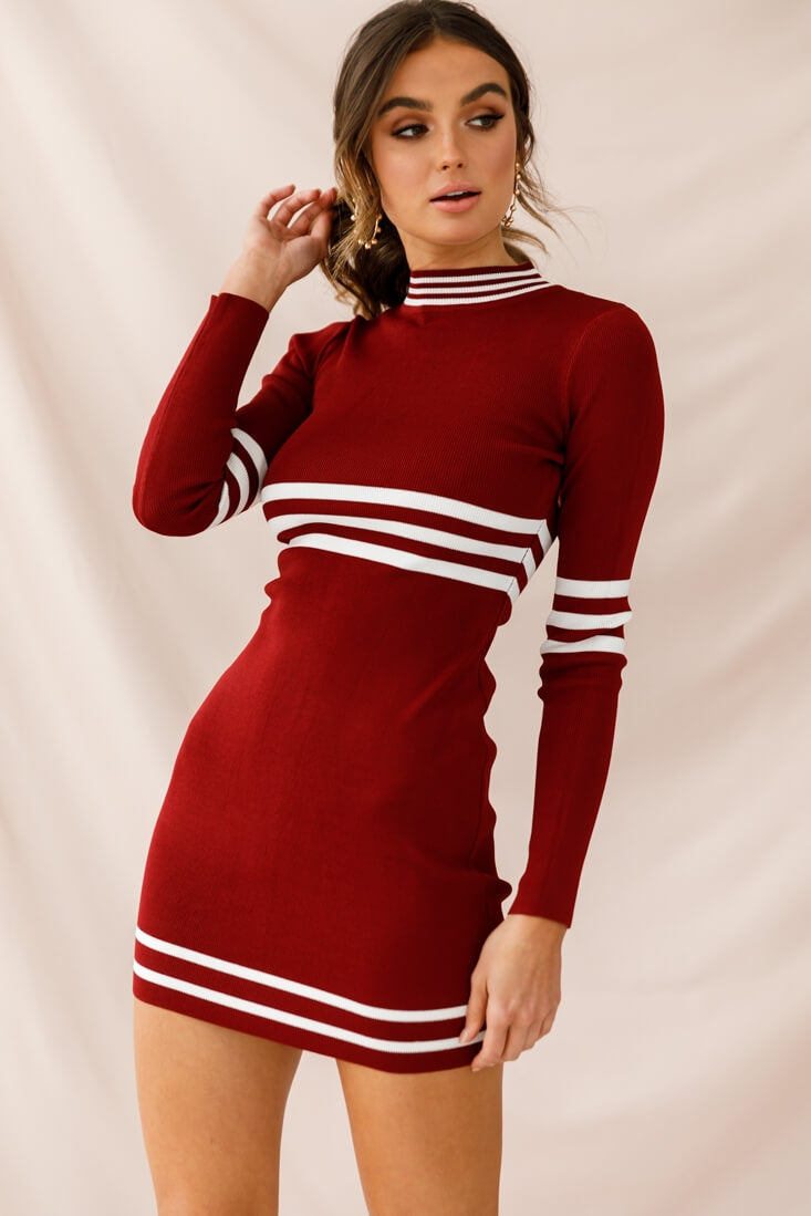 You'll be out of his league in our super hot Varsity mini dress. Featuring sporty stripes, long sleeves, stretchy fabric and turtle neckline, you'll be the best dressed champion in your squad. Score extra points by teaming it with black suede thigh-high boots and watch him try and win your affection.
