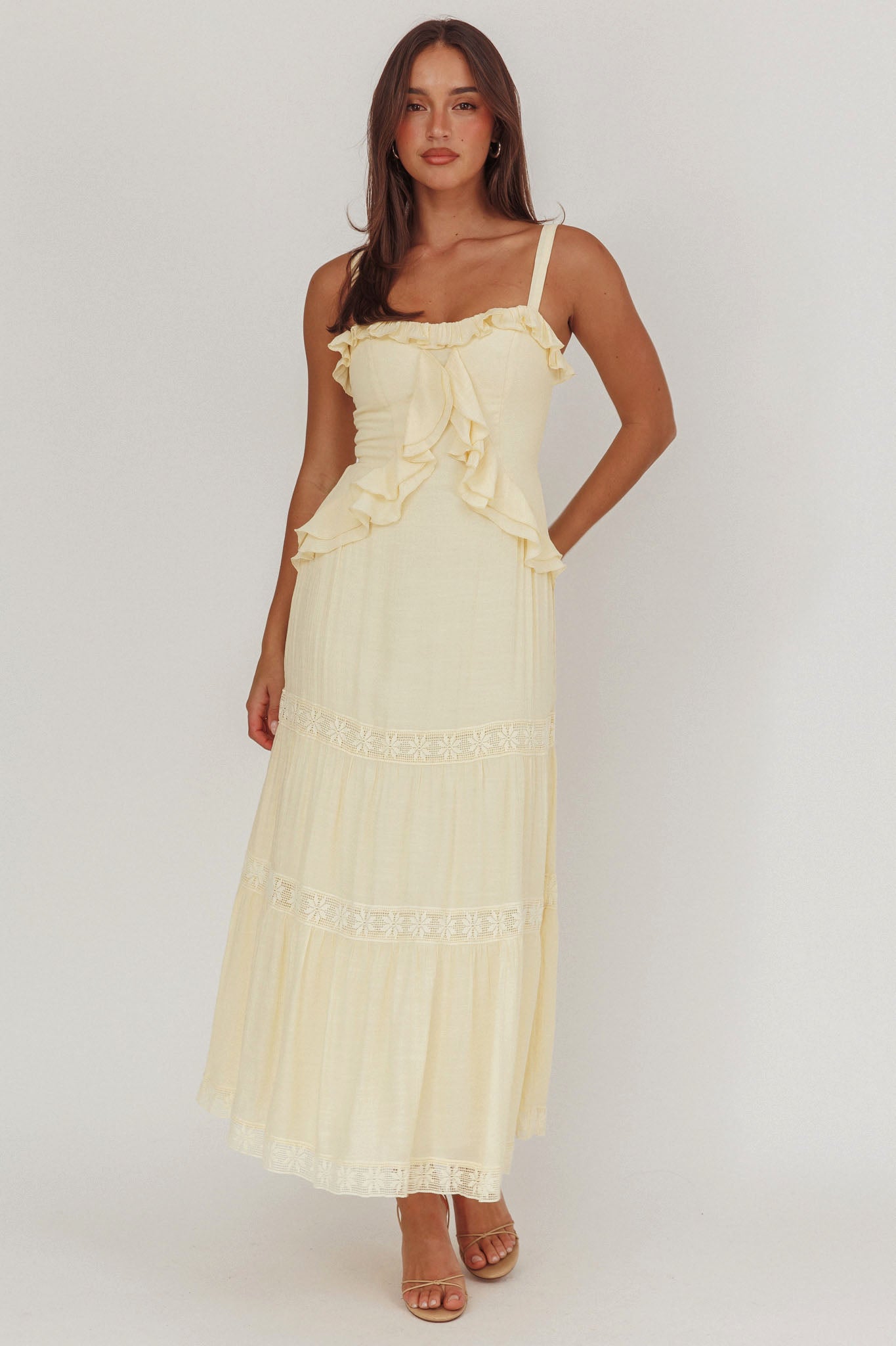 Vienna Sky Frill And Crochet Trim Maxi Dress Cream