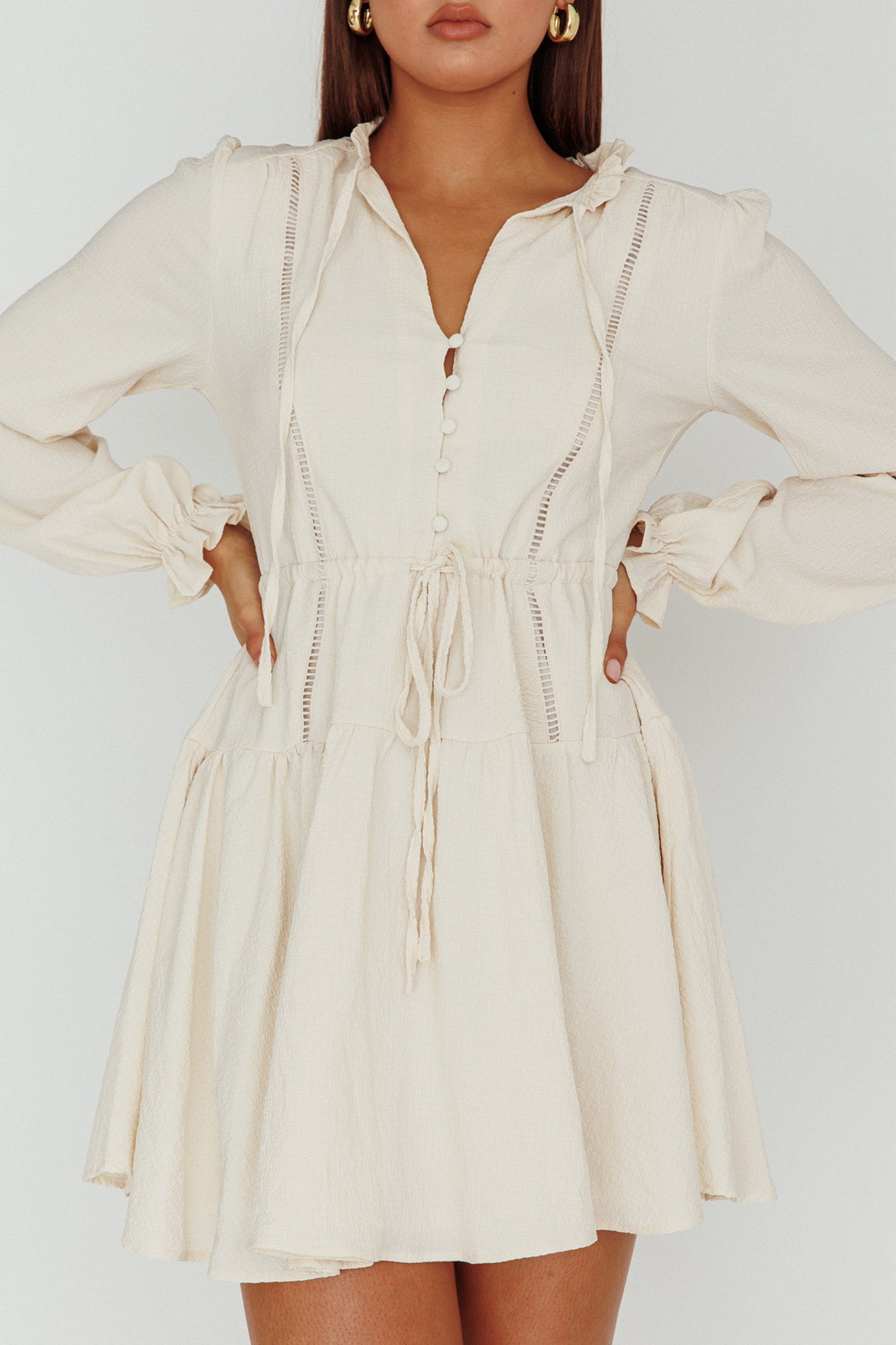Hey there, cutie! We are in love with our adorable Waverly mini dress. Featuring long sleeves, and a drawstring waist, it's perfect for a crisp day strolling the farmers markets teamed with riding boots and a tote.