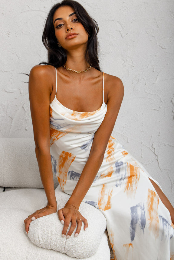 Well Versed Pleated Bust Front Split Dress Paint Print Blue/Orange