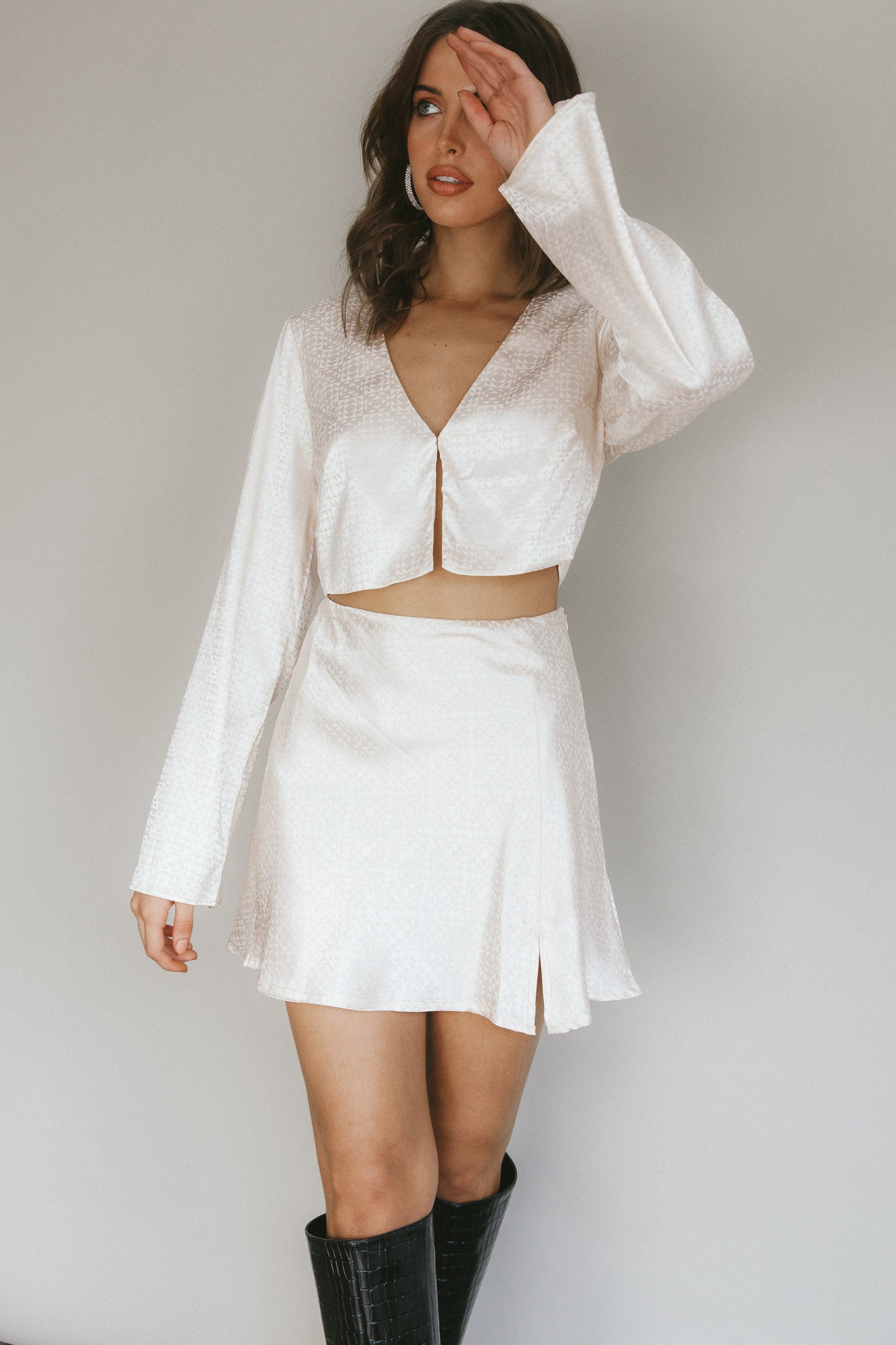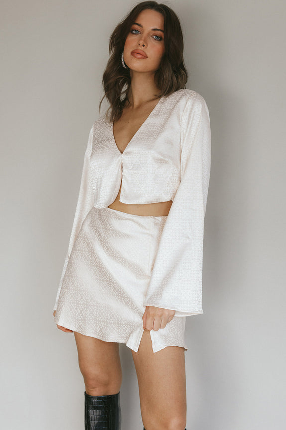 Make a statement in our super cute Winona skirt. Featuring a pretty, jacquard satin fabric, it's perfect for your 9-5 or a romantic date night. Team it with our Reese crop top and boots for a look we are loving.