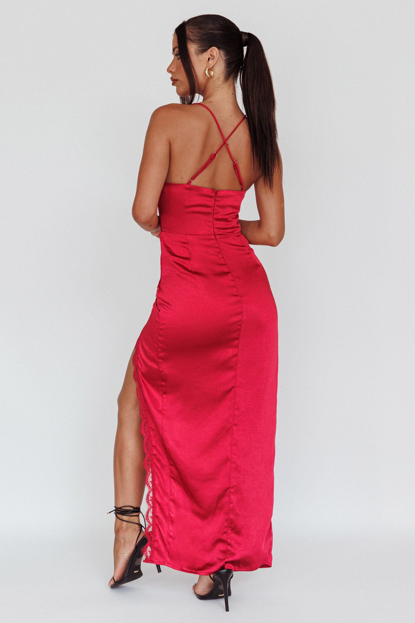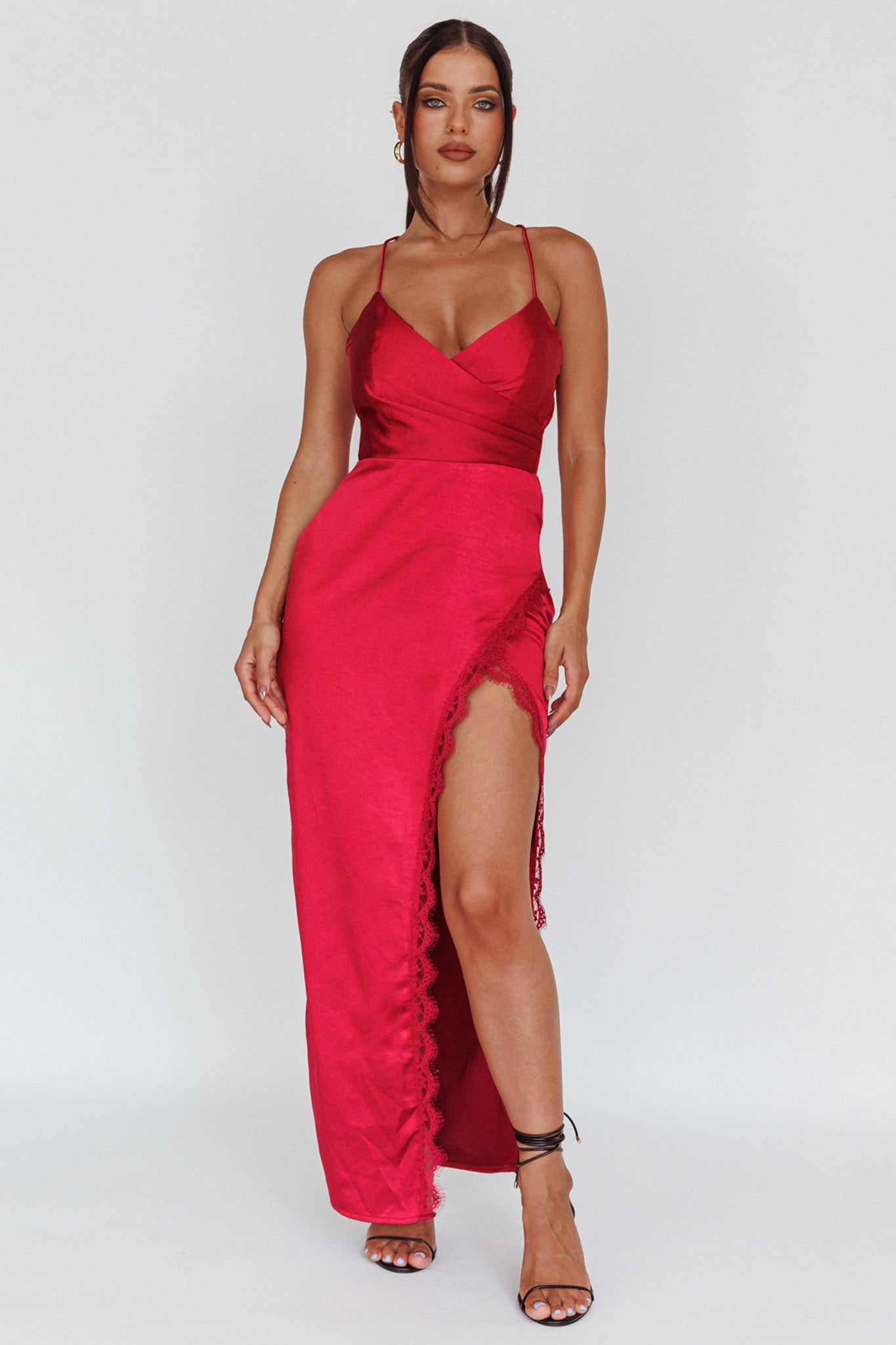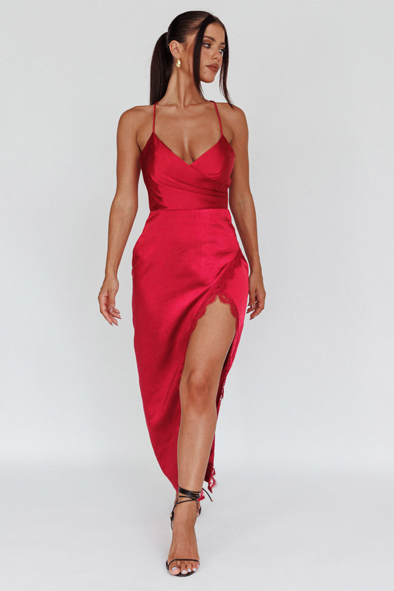 Steal the spotlight in our stunning Winter Moon midi dress. Featuring a split in the front with eyelash lace trim. It's perfect for prom or a special gala event. Team it with black, strappy heels and a purse for an unforgettable look.