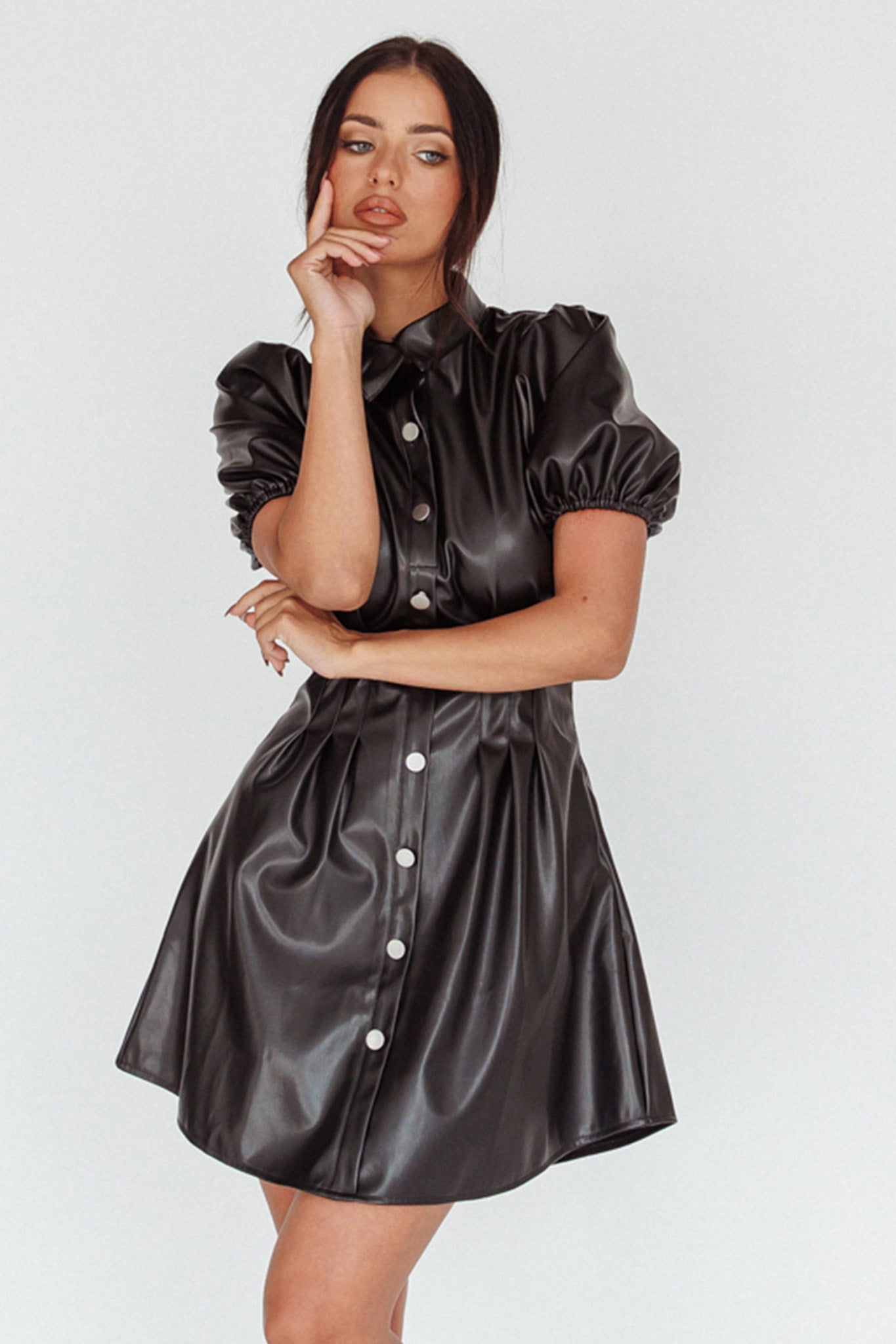 Zurich Pleated Waist Shirt Dress Faux Leather Black